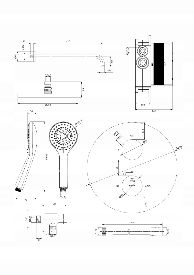 - присутній елемент для термостатичного душу-vanae (boxte2f) li> brass baster-vanae batterye (boxte2f) Brass Brass Baskeae Batterye (boxte2f). До SET1CP), розмір: Ø25 см, діапазон від стіни: 41 см
