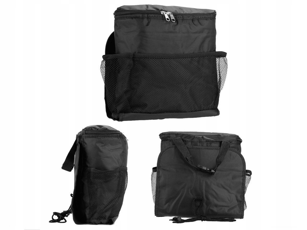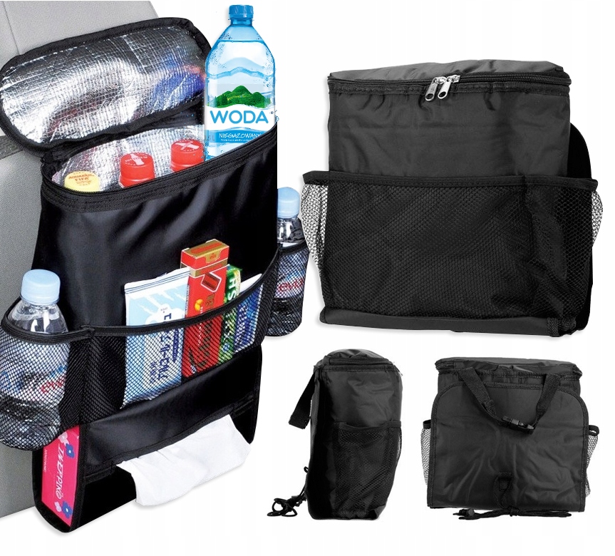 - Термосумка закривається на подвійну блискавку. Кріпиться до підголівника ремінцем із застібкою, який також можна використовувати як ручку для сумки.