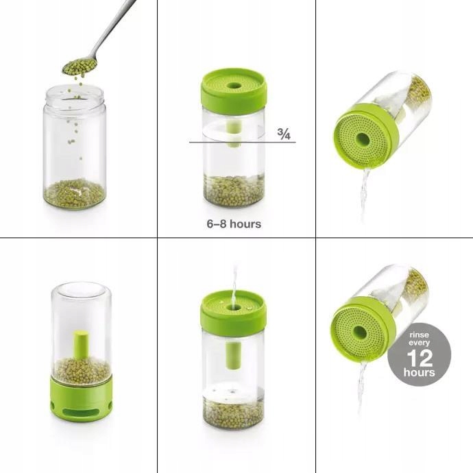 Чаша в кришці захоплює надлишок води під час фази проростання. Пророщувач виготовлений із міцного скла та пластику. Можна мити в посудомийній машині.