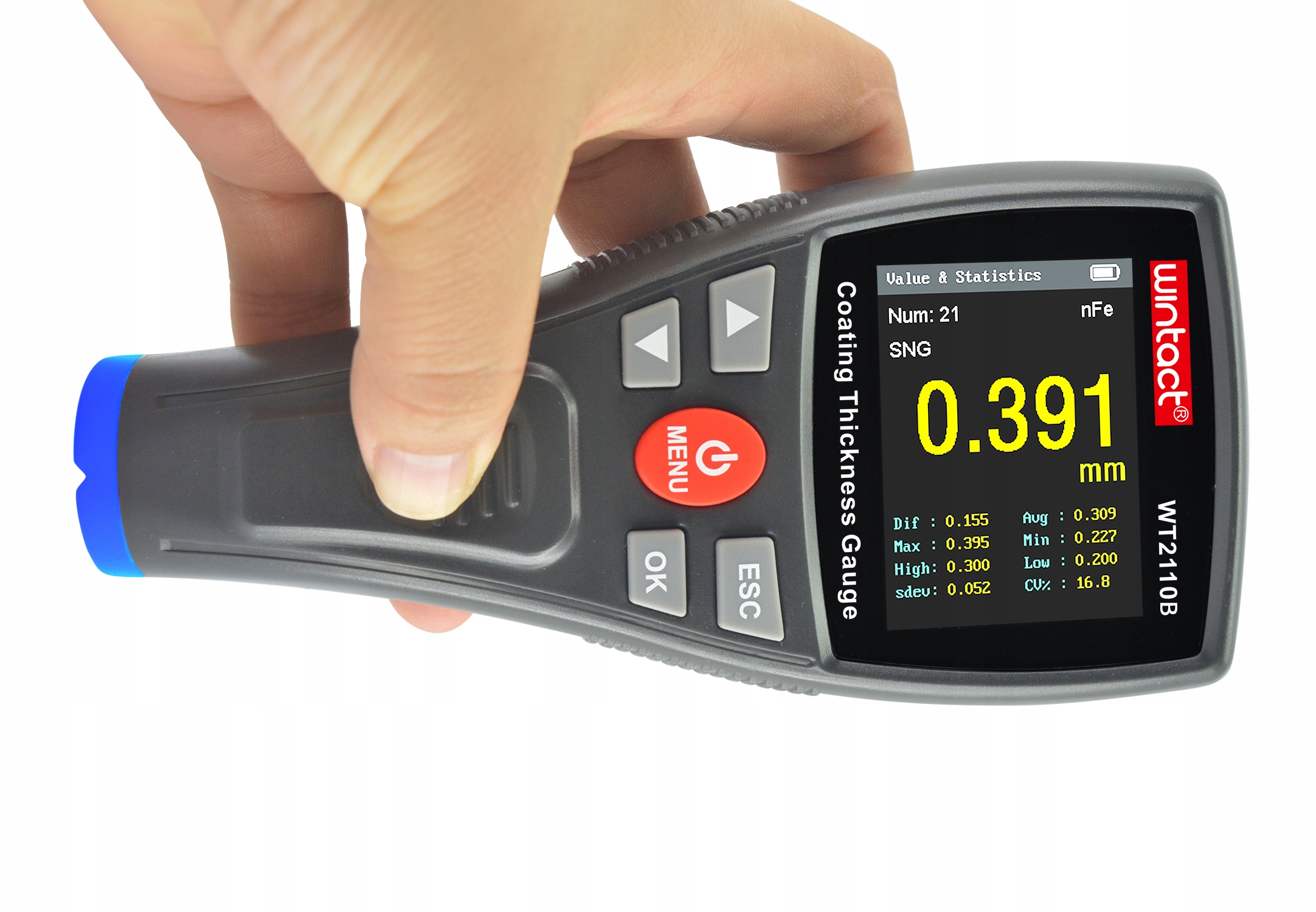 Професійний прилад для швидкого й точного вимірювання товщини немагнітного покриття на поверхні магнітної металева підкладка та неметалеве покриття на немагнітній металевій підкладці. Продукт широко використовується в хімічній і металургійній промисловості, контролі якості товарів, особливо в автомобільній промисловості та багатьох інших сферах. Лічильник оснащений кольоровим дисплеєм високої роздільної здатності (HD).