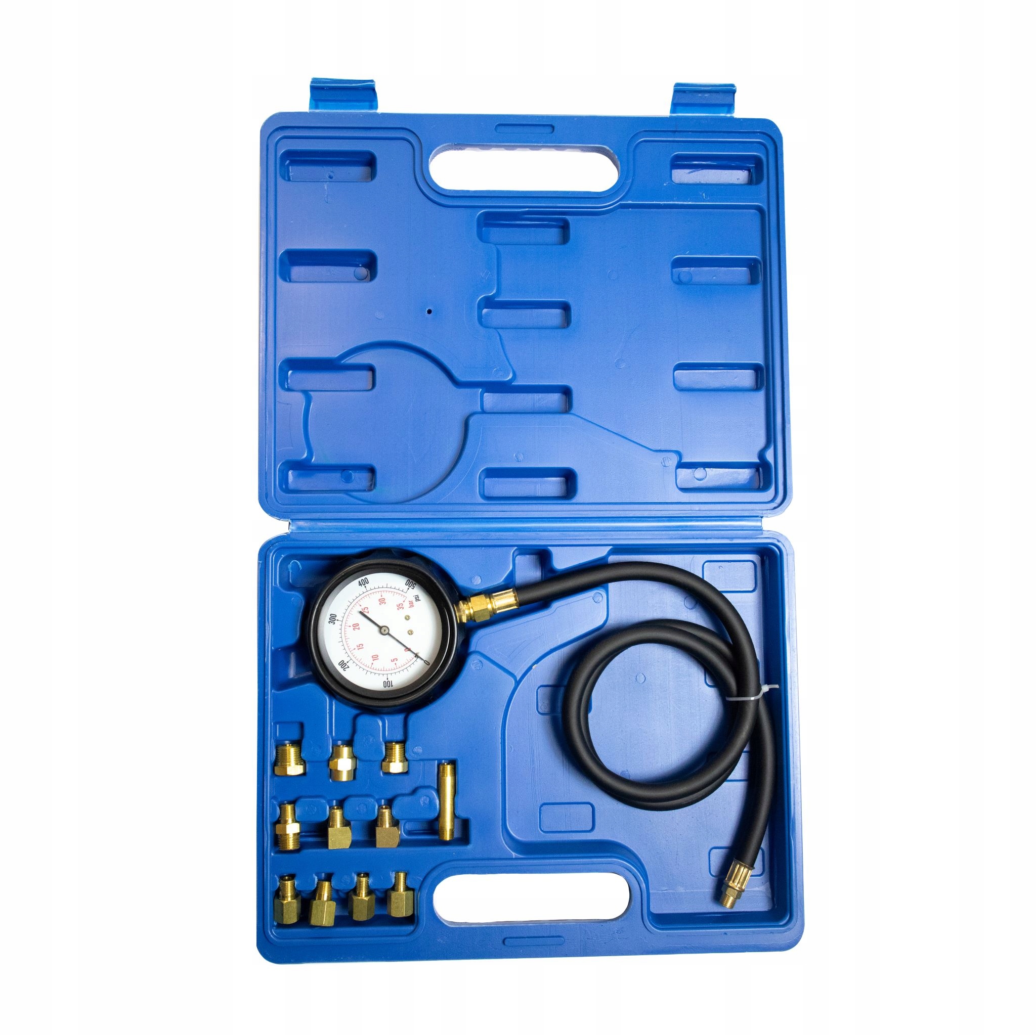 Набір для перевірки тиску в масляній системі двигуна. Дозволяє раннє виявлення несправності масляного насоса або забруднення масляних каналів. Це може означати зменшення витрат на капітальний ремонт заблокованого двигуна. Набір поставляється у зручній валізі та підходить для більшості двигунів. Його можна використовувати як в бензинових, так і в дизельних двигунах. Набір з безлічі перехідників дозволить підібрати потрібний наконечник. Манометр має гумовий чохол для захисту від пошкоджень після падіння. Тестер має довгий гнучкий шланг.