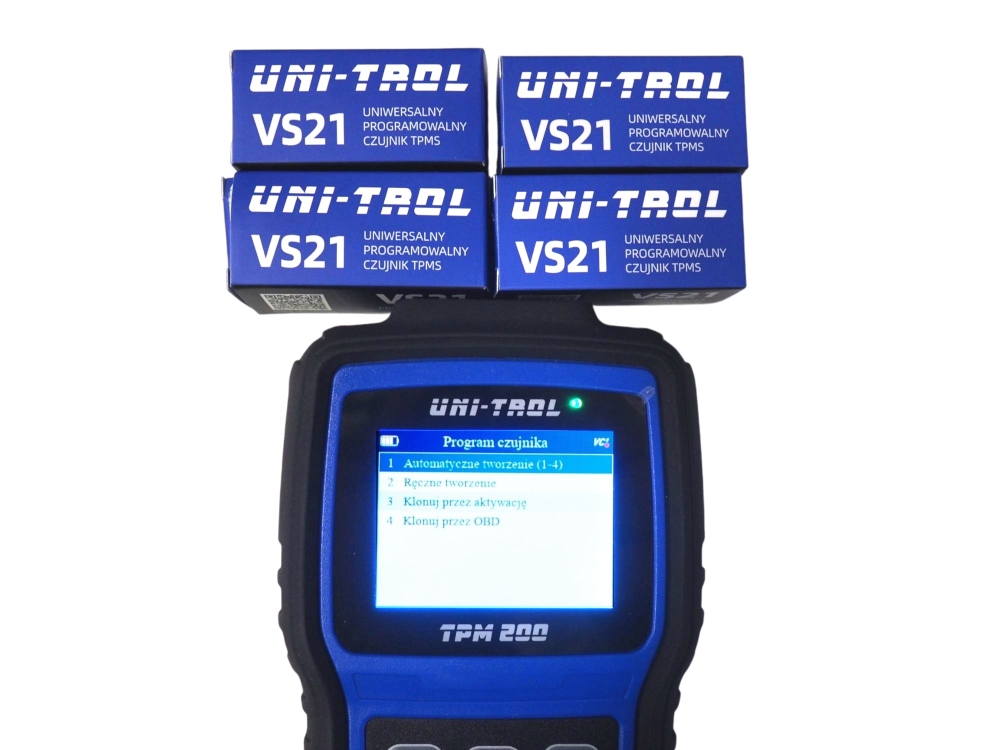 Програмування універсальних датчиків Uni-Trol VS21 - це дозволяє використовувати один датчик в будь-якому автомобілі, що оптимізує інвентар майстерні. Ідентифікаційний номер в датчику може бути призначений автоматично, тоді пристрій дозволяє одночасне програмування до 4 датчиків. Другий варіант - копія зі старого датчика після зчитування приладом або введення вручну з корпусу датчика. У більшості автомобілів також можна прочитати пам'ять блоку керування TPMS після підключення модуля Uni-Link до гнізда OBD.