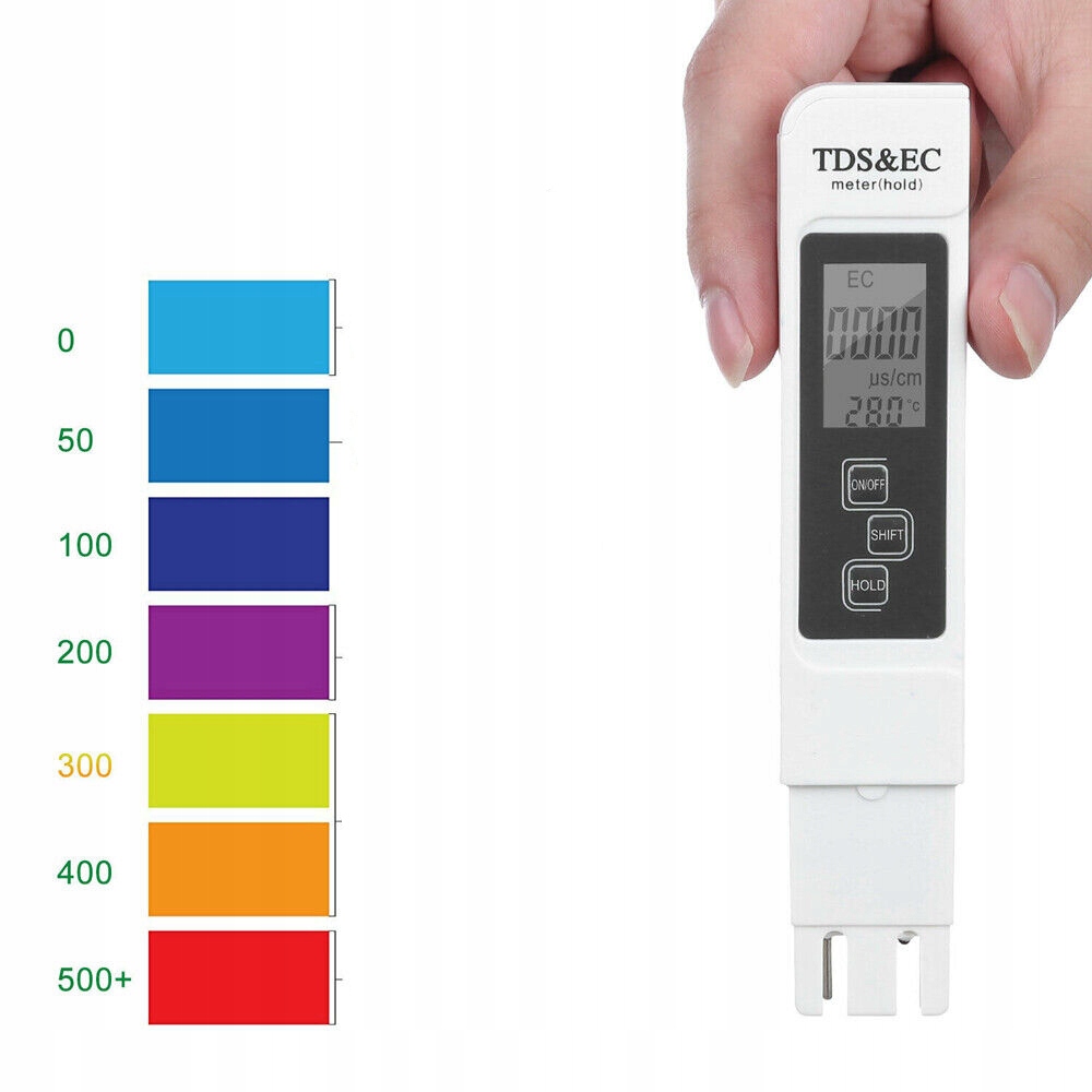 Вимірювач TDS: TDS означає «Загальна кількість розчинених твердих речовин». Чим вище значення TDS-метра, тим більше розчинених речовин міститься в досліджуваній рідині. Чим нижче значення, тим вища якість води.