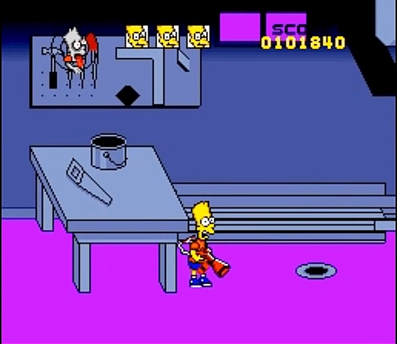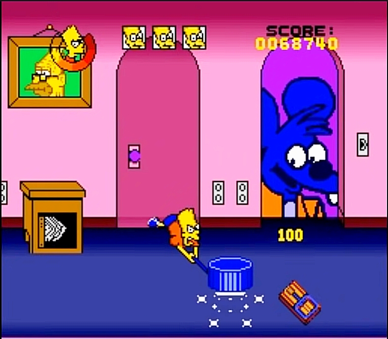 Гра поділена на дві частини. Дія першого відбувається на вулиці (ймовірно, Evergreen Terrace, але називається Windy World). Барт гуляє по околицях і повинен знайти сторінки домашнього завдання, уникаючи ворогів, таких як живі поштові скриньки та різні персонажі з серіалу. Бонуси, які Барт може збирати, включають жуйку (яку він може використовувати, щоб надувати бульбашки, щоб відбити ворогів, або збирати плаваючі сині букви Z, щоб відновити своє здоров’я), насіння кавуна (якими він може плюнути у ворогів, щоб перемогти їх або змусити їх змінити напрямок руху) ), подушки (які створюють для нього нову смужку здоров’я, якщо у нього закінчується Z), і ховерборд (який тимчасово збільшує його швидкість, а також відновлює та розширює його смужку здоров’я, чим довше він на ній залишається). Джимбо та його банда змусять Барта йти з ними, через що Барт втратить контроль над своїми рухами та буде змушений рухатися разом з ними, отримавши при цьому травму. Удар по літаючому саксофону викличе Лізу Сімпсон з казковими крилами, яка посипає Джимбо та його банду казковим пилом і перетворить їх на щурів, звільнивши Барта. Однак якщо Барт залишиться один, фея Ліза перетворить його на жабу, яка не вміє нападати. Якщо Барт зловить поцілунок, надісланий йому старою леді, це поверне йому людську подобу.