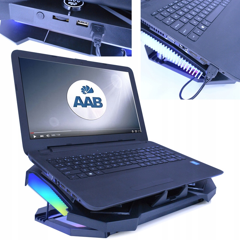 Простий у використанні та легкому встановленні. Покладіть ноутбук на планшет і підключіть кабель USB до порту USB. Поверніть ручку регулятора вправо, щоб запустити вентилятори. Ручка розташована на задній частині підставки біля портів USB. Додатковою перевагою є додатковий порт USB в підставці, до якого можна підключити додаткове обладнання, наприклад, мишку або флеш-накопичувач. Кнопка поруч із ручним контролером швидкості дозволяє керувати світлодіодним підсвічуванням RGB (утримуючи кнопку протягом 3 секунд, вмикається/вимикається підсвічування збоку RGB)