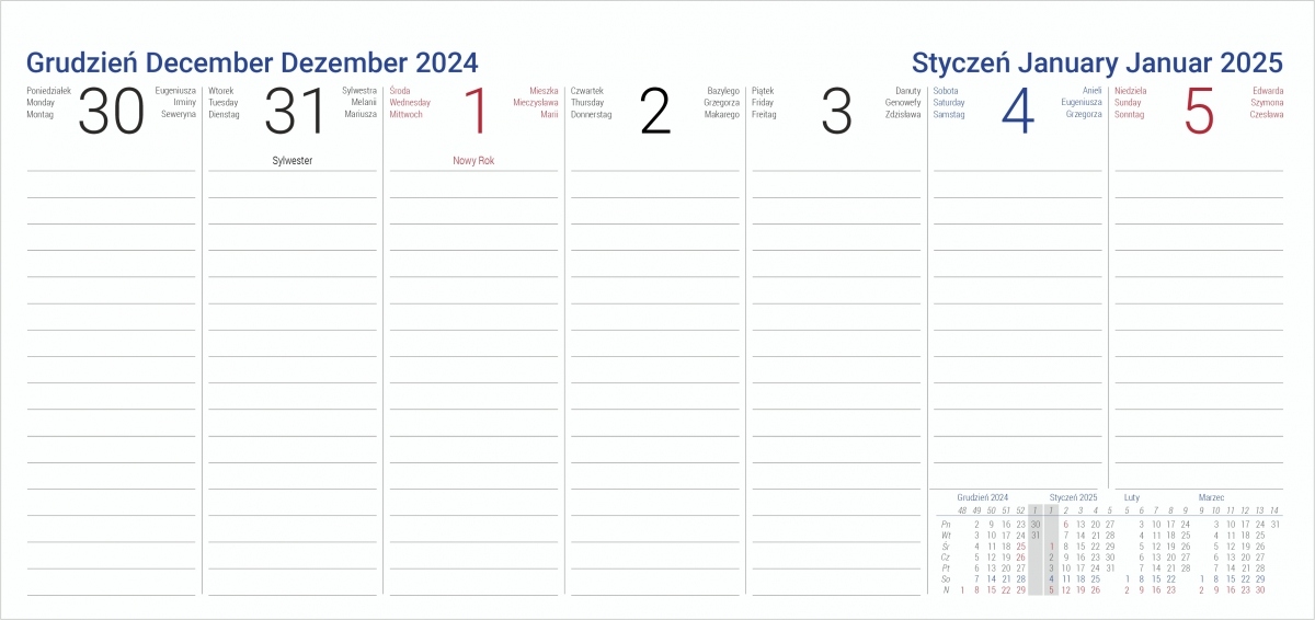 Календар містить іменини, національні та релігійні свята та особливі події. На початку календаря – чіткий план на 2024/2025 навчальний рік. Таблиця, яка містить важливу інформацію про організацію 2024/25 навчального року, дозволяє, серед іншого, перевірити дати зимових канікул в окремих воєводствах, вихідні дні від навчальних і виховних заходів, канікулярні перерви в навчанні та дати початку та закінчення навчального року.