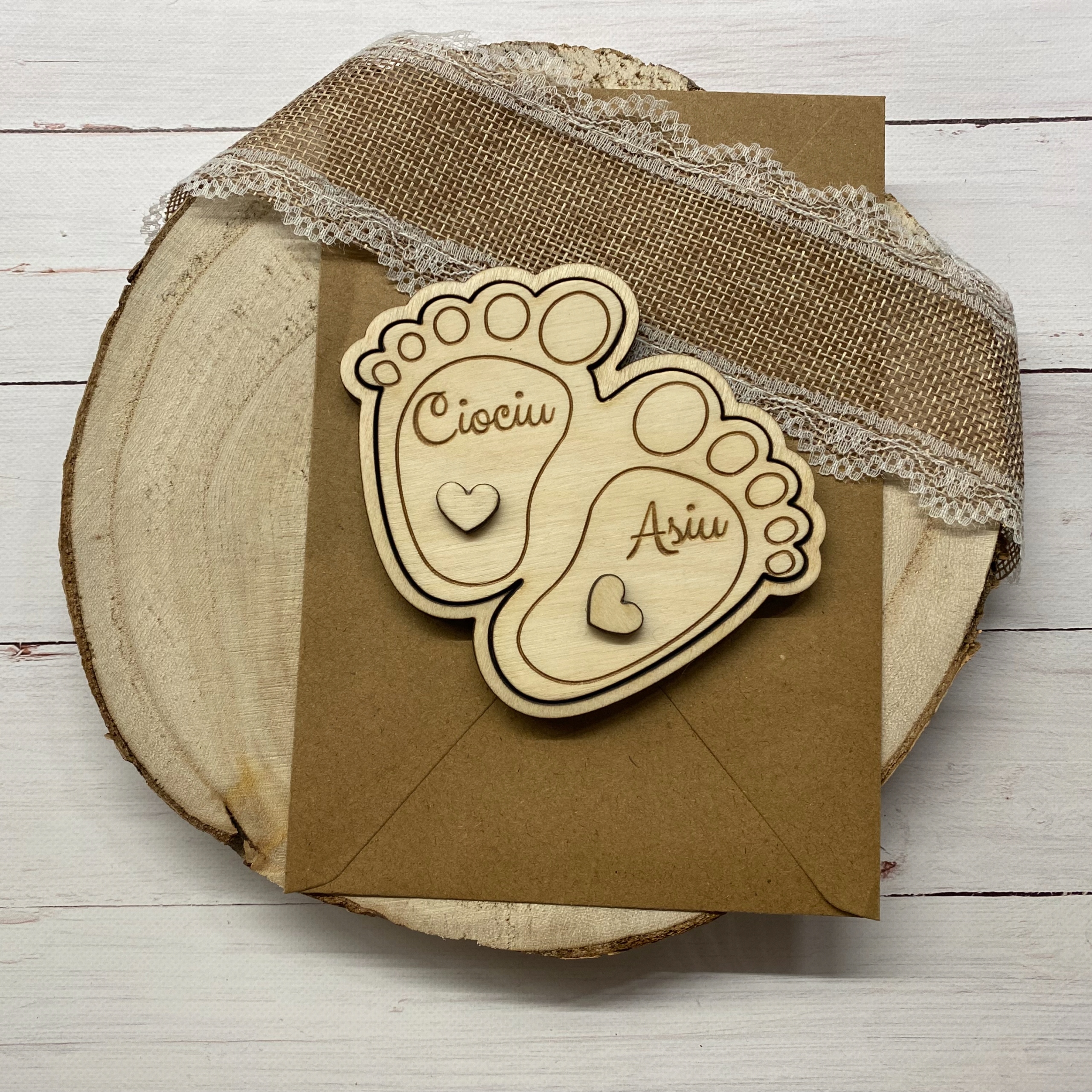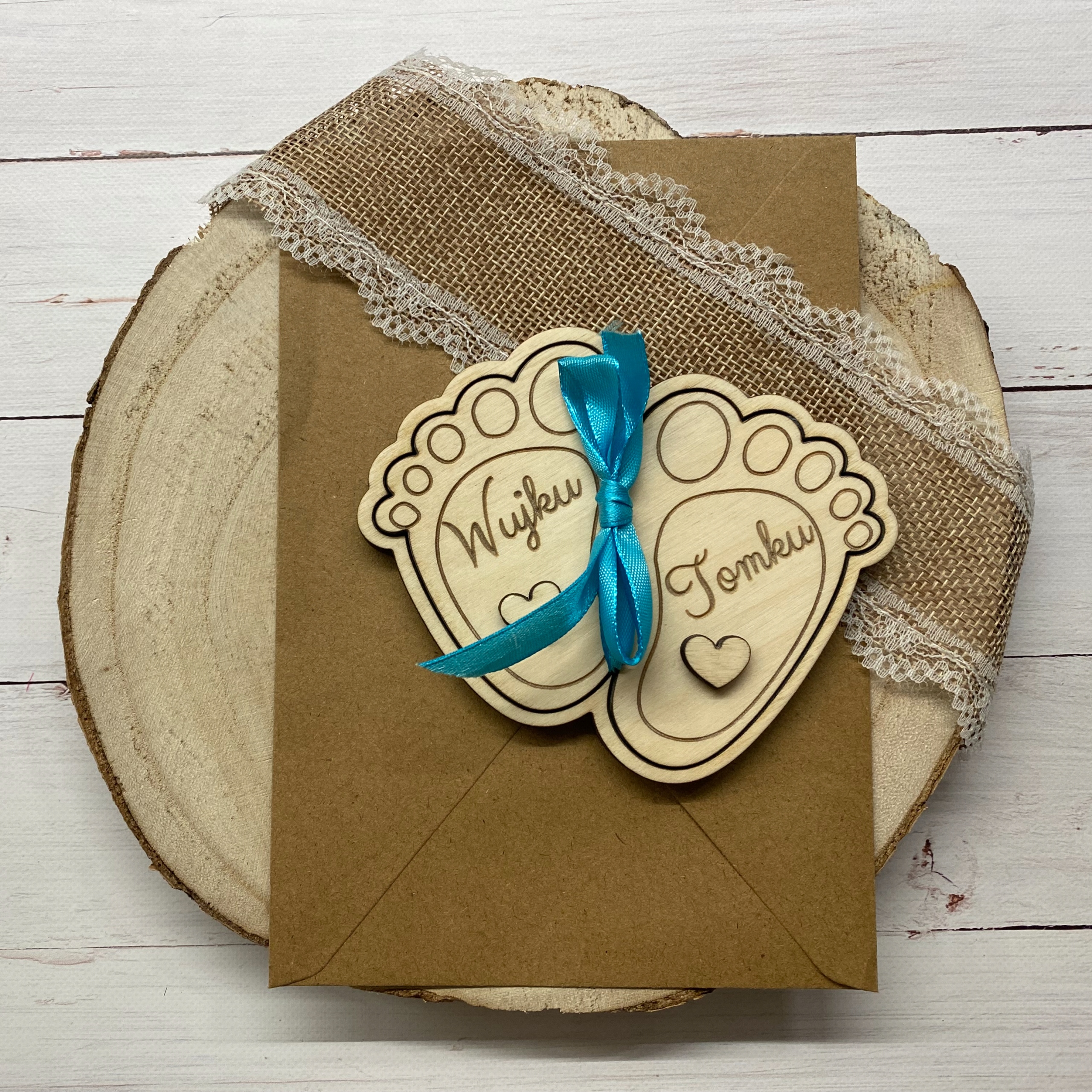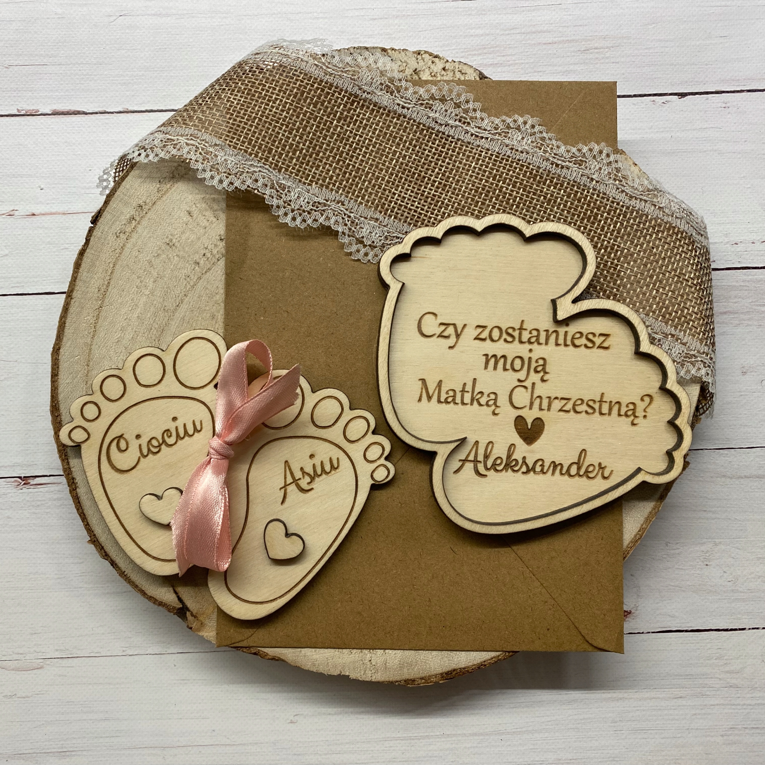 - Дерев'яна листівка-запрошення (розмір ніжок приблизно 10х10 см) " З іменним написом (Будь ласка, вкажіть імена хресних батьків) напр., «Тітка Каролінка», «Дядько Марчін» тощо.