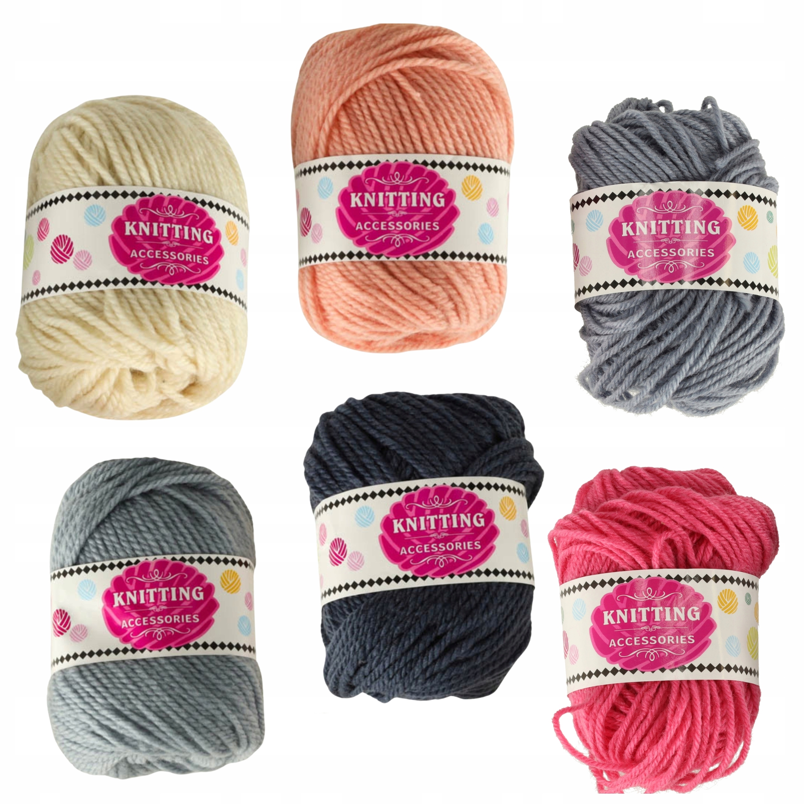 ⭐ КОЛЬОРОВИЙ НАБІР – 6 ниток пряжі красивих відтінків: кремовий, сірий (2x), темно-синій, оранжевий і рожевий.