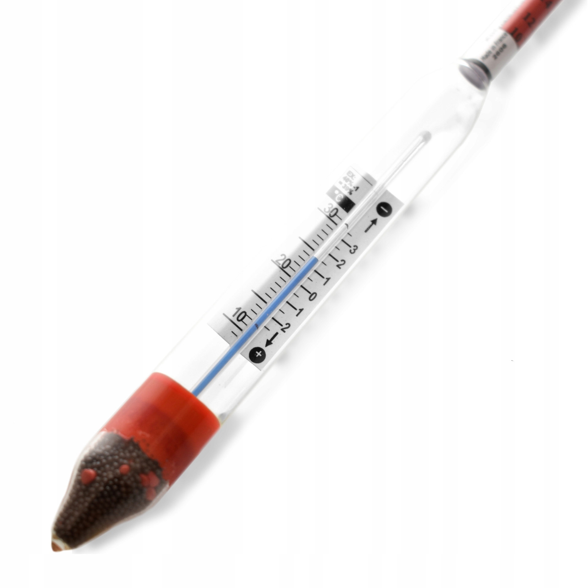 Test діапазон: 0 – 100% об’ємної концентрації алкоголю (ABV), тобто % об’єму, відомо всім. Крім того, спиртомір має шкалу Картьє (червона шкала) відповідно до чинних норм ця шкала більше не використовується.