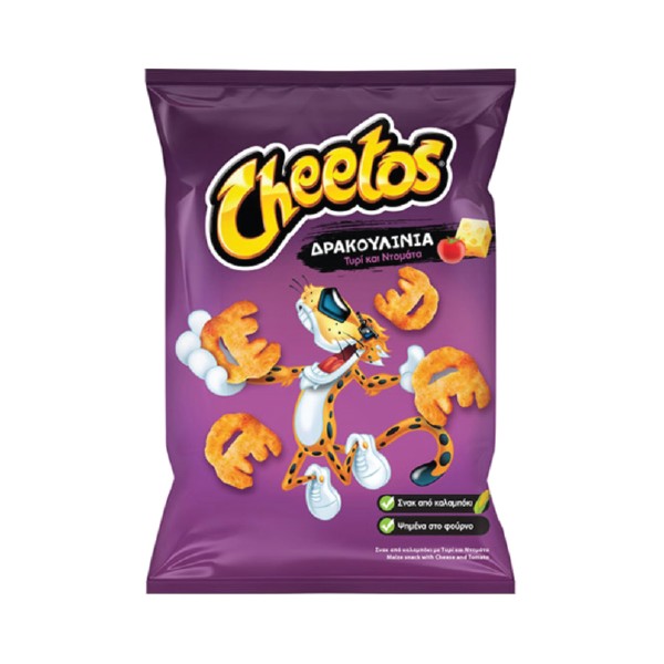 Улюблені всіма дітьми, хрусткі та смачні слойки зі смаком сиру та помідорів. Dracoulinia Cheetos з кукурудзяного борошна та картоплі з характерним поєднанням сирних смаків. Смачна закуска на вечір. Замовляйте, щоб насолодитися кіновечорами з родиною!