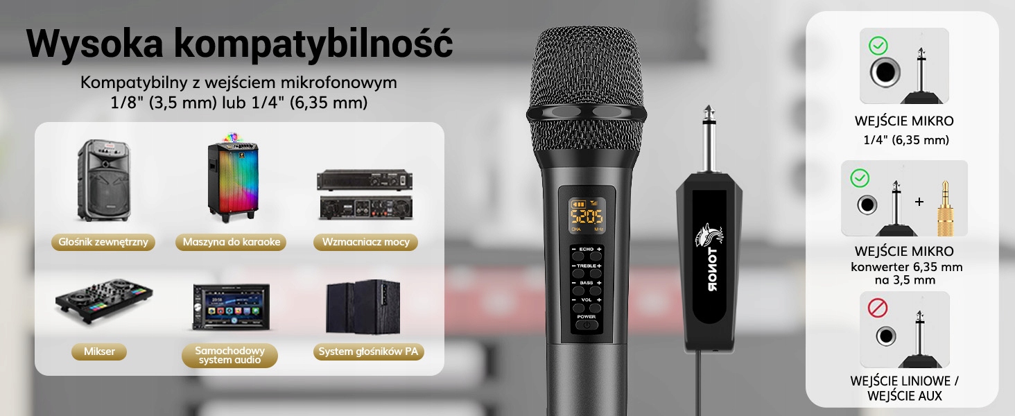Висока сумісність: наш мікрофон для караоке можна легко підключити до підсилювачів, звукових систем, караоке-машин і активних колонок. У комплект також входить конвертер 6,35 мм на 3,5 мм, що дозволяє їх підключити. Зауважте, що мікрофон не сумісний із ноутбуками, iPad або мобільними телефонами.