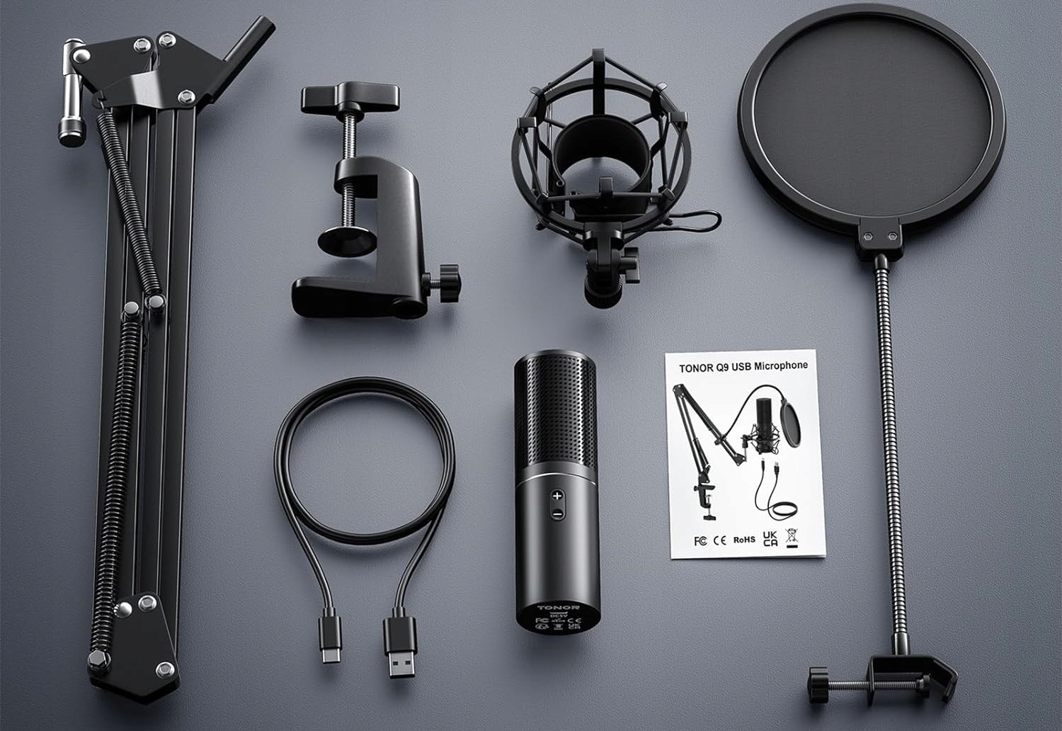 Набір Tonor Q9 містить усі необхідні аксесуари, які дозволять вам одразу розпочати запис. Регульована штанга, металеве амортизаційне кріплення, затискач для кріплення на столі, поп-фільтр, пінопластовий чохол для мікрофона, кабель USB A–B 1,8 МБ та посібник користувача – усе в комплекті. Не потрібно інвестувати в додаткові аксесуари, Tonor Q9 надасть вам усе, що вам потрібно, щоб розпочати кар’єру в потоковій трансляції ігор або створенні контенту.