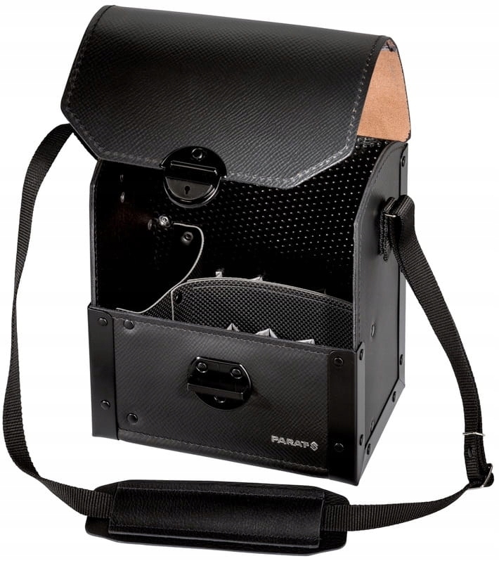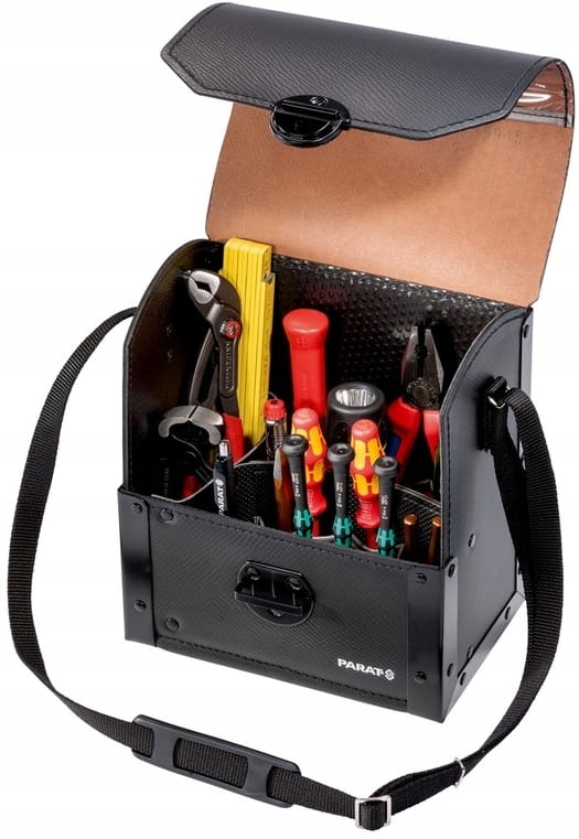 Професійна сумка Parat високого класу для зберігання та транспортування інструментів для електрика або електромонтажника, корисна, наприклад, при виконанні електричних вимірювань. Сумка з натуральної шкіри, внутрішні стінки з водонепроникного матеріалу Con-Pearl® з 17 кишенями для інструментів. 1 прозора пластикова кишеня для документів на внутрішній стороні клапана. Сумка має посилені кути та регульований ремінь.