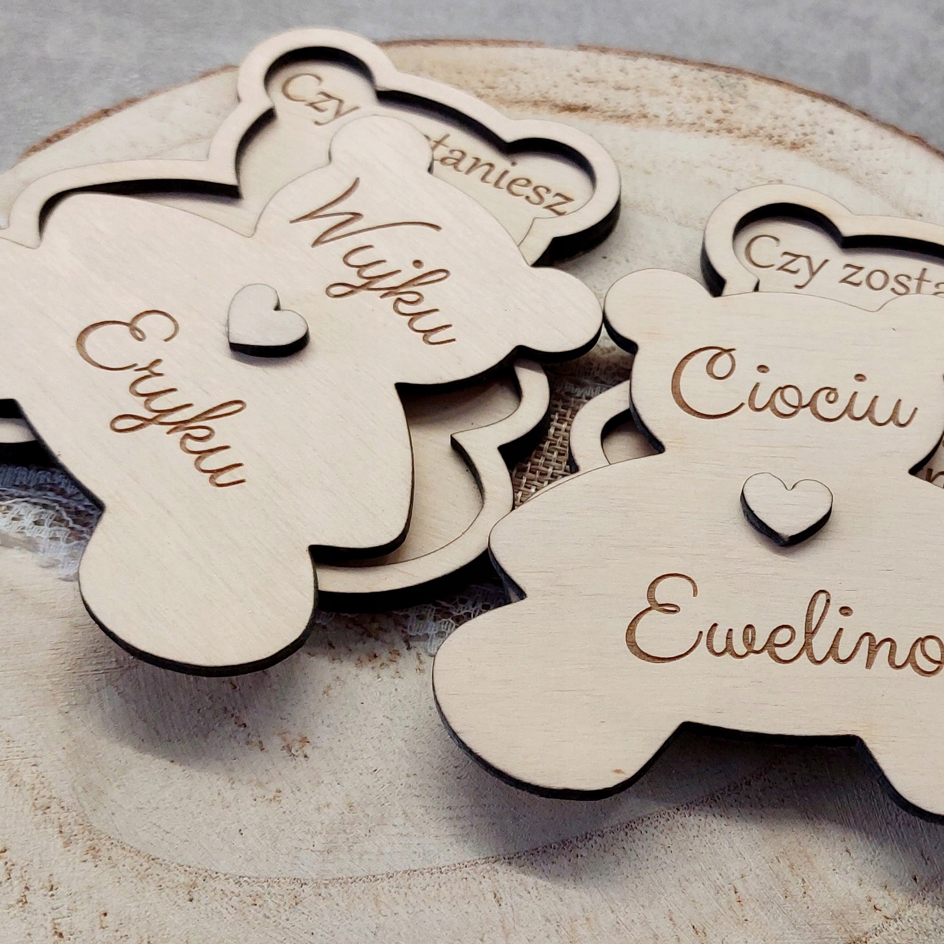 - Дерев'яна листівка-запрошення (плюшевий ведмедик, розміри прибл. 10 х 10 см) " З персоналізованою напис (вкажіть імена хресних батьків), наприклад, «Тітка Каролінка», «Дядько Марчін» тощо.