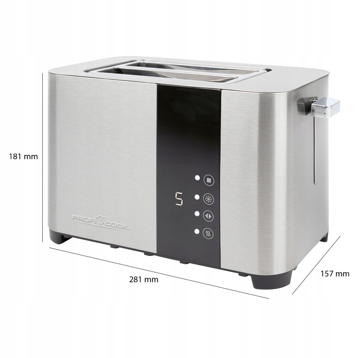 ⭐ProfiCook PC-TA — прилад, необхідний для приготування смачних, хрустких тостів і сухариків. Корпус виготовлений з нержавіючої сталі, а управління здійснюється за допомогою сучасної сенсорної панелі з підсвічуванням. Завдяки цьому ви можете вибрати дію, яку хочете виконати: розморожування, нагрівання та швидку зупинку. Широкі прорізи для скибочок мають до 4 см і адаптуються до хліба, який підсмажується - завдяки цьому ви можете приготувати, наприклад, брускетту.
