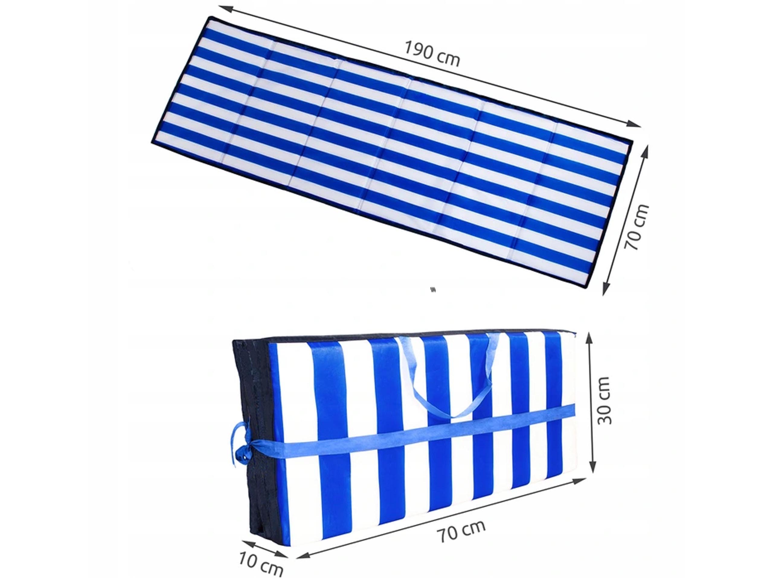 Килимок ідеально підходить для кам’янистих і галечних пляжів. Матрац складається як гармошка - має шість частин, які в складеному вигляді перетворюються в невеликий куб. Крім того, він оснащений ручкою для зручного перенесення. Килимок має спеціальну товсту еластичну стрічку, яка надівається на нього після складання, тому він не розгорнеться під час транспортування чи зберігання.