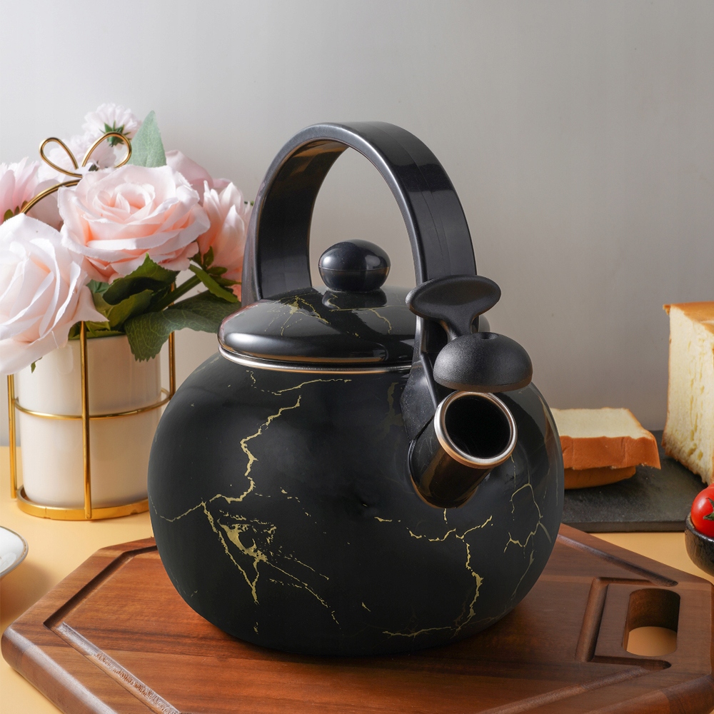 - Виготовлений з постійної вуглецевої сталі з товщиною 0,8 мм, цей чайник покритий високоякісною емальою як всередині, так і ззаду.