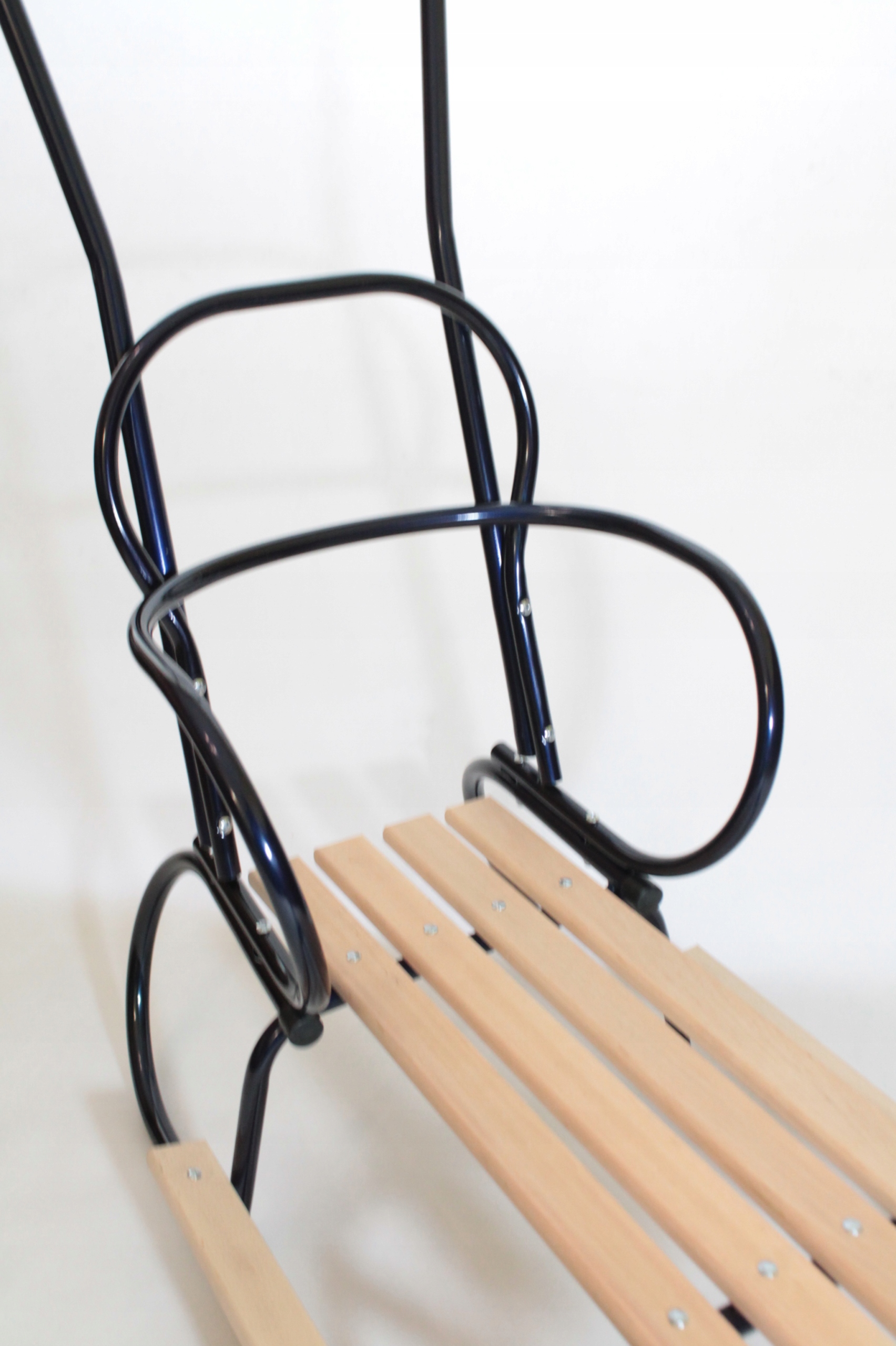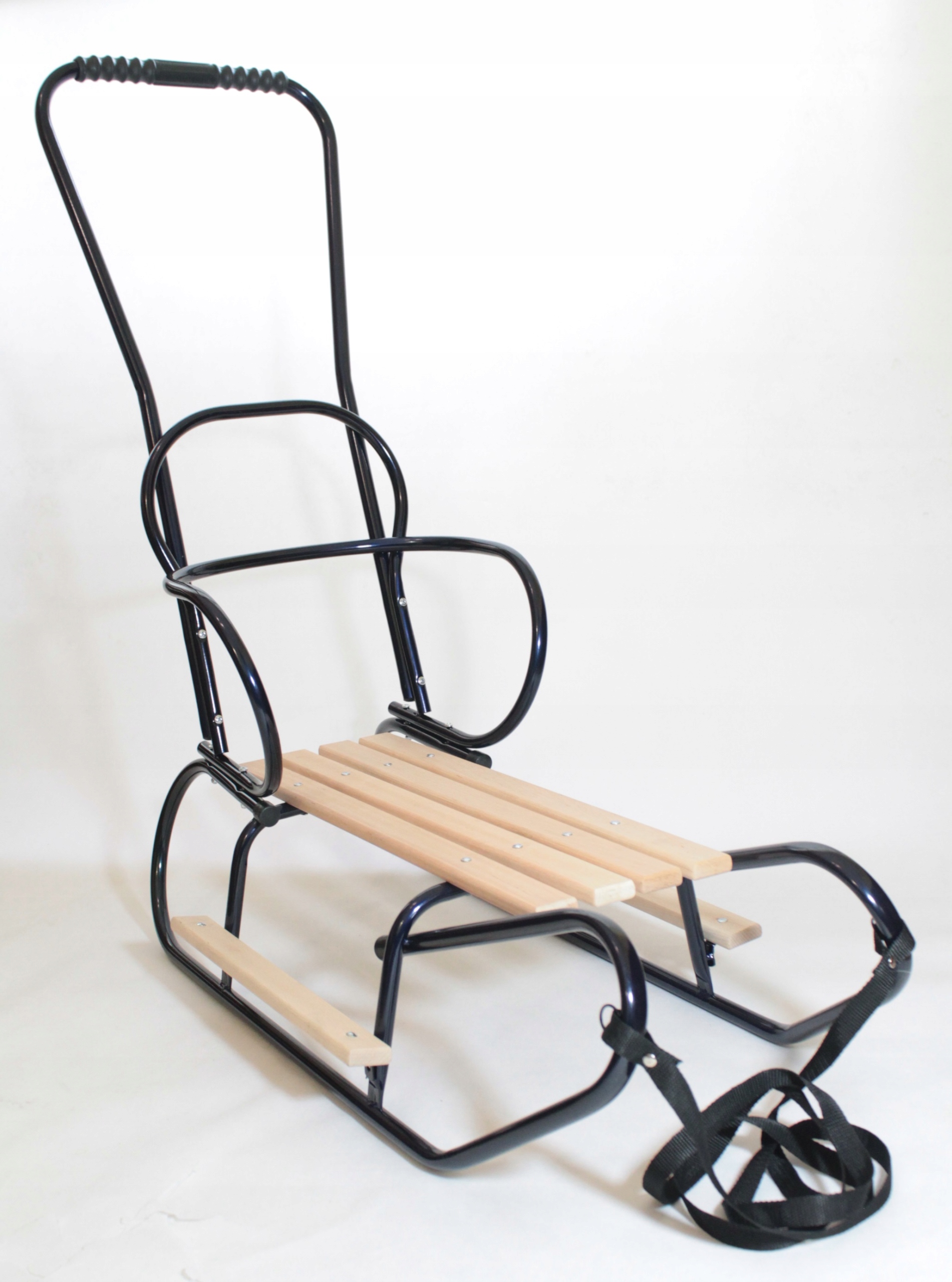 Сильні металеві санки, що виробляються в Польщі з розібраними високими спиною, штовхачами та підставками