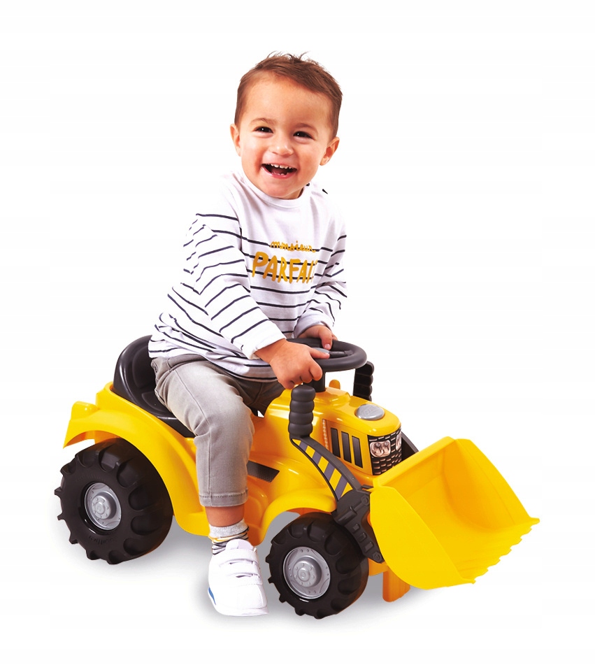 Автомобіль має сидіння для дітей віком від 12 до 36 місяців з сховищем для скарбів, рухомі колеса та бульдозерний ковш, керований ручками з обох боків керування колесо.