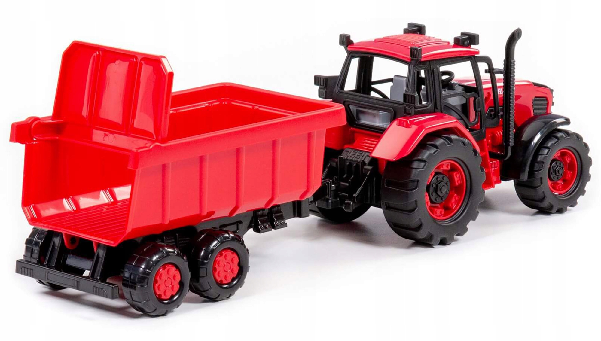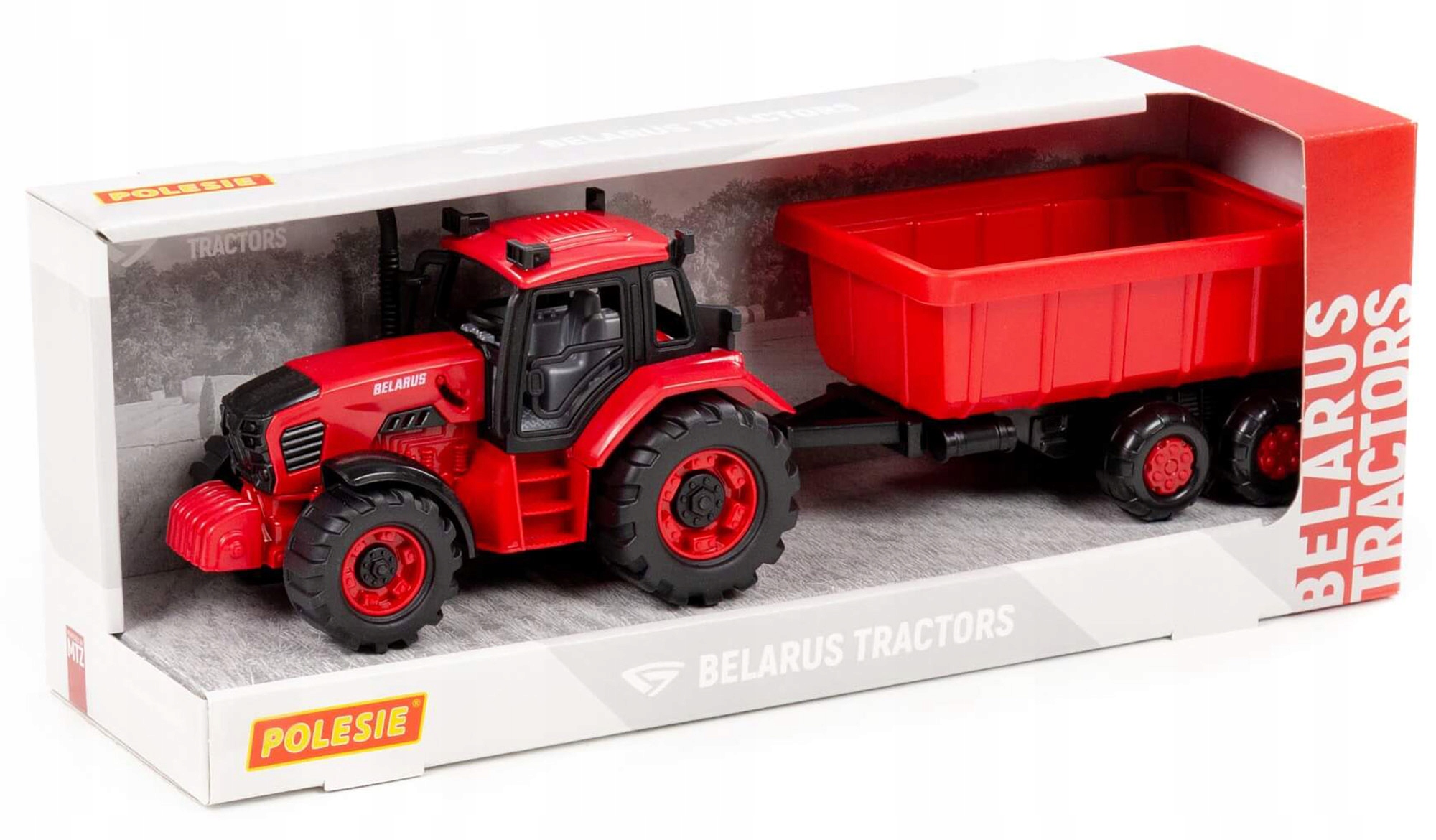 Трактор і причіп БІЛАРУС (БІЛОРУС) - це ідеальна копія справжнього транспортного засобу, розроблена з увагою до кожної деталі. Оснащений фрикційним приводом і гаком, до якого можна кріпити різні причепи.