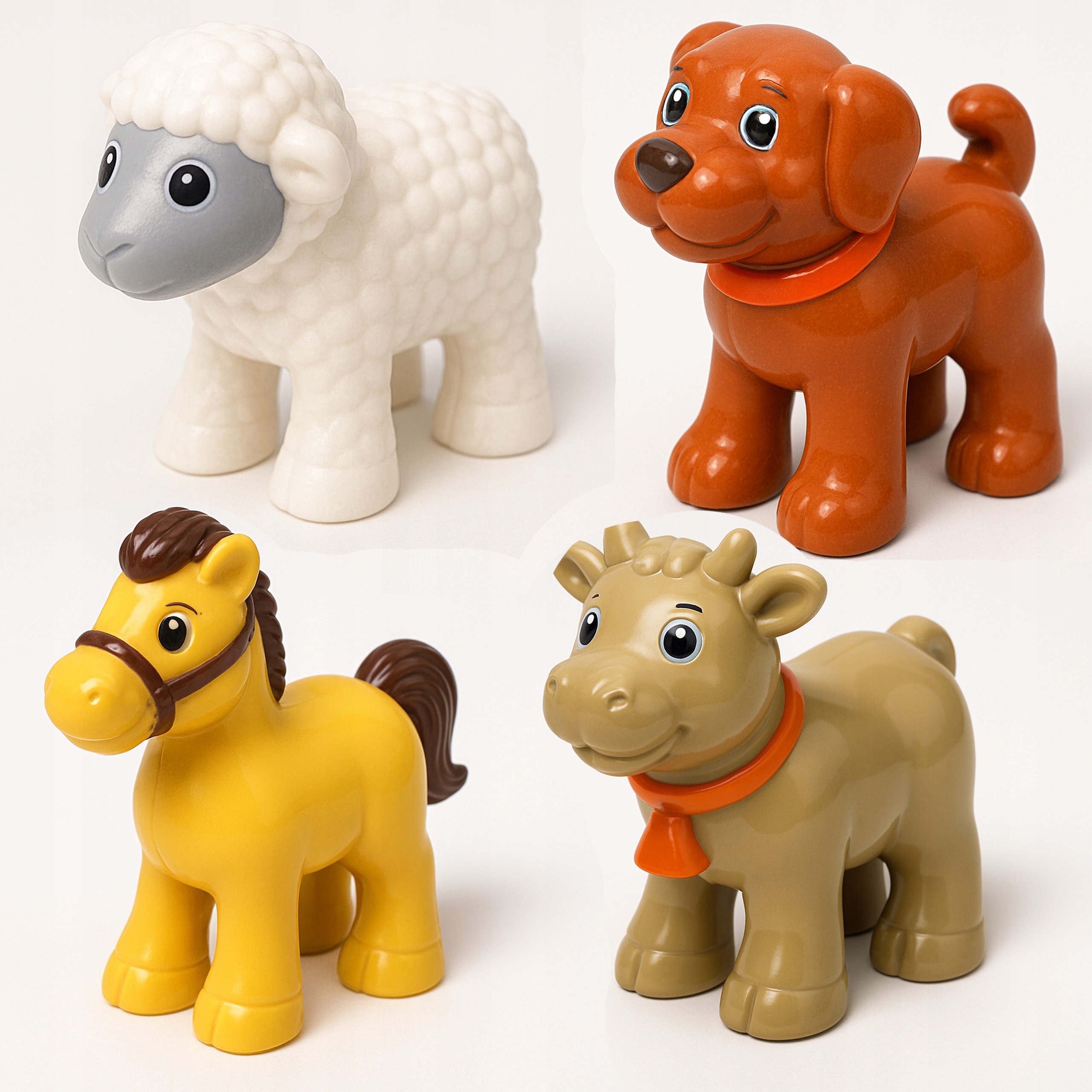 ✅ У набір входять фермер і 4 фігурки тварин: кінь, собака, вівця, корова