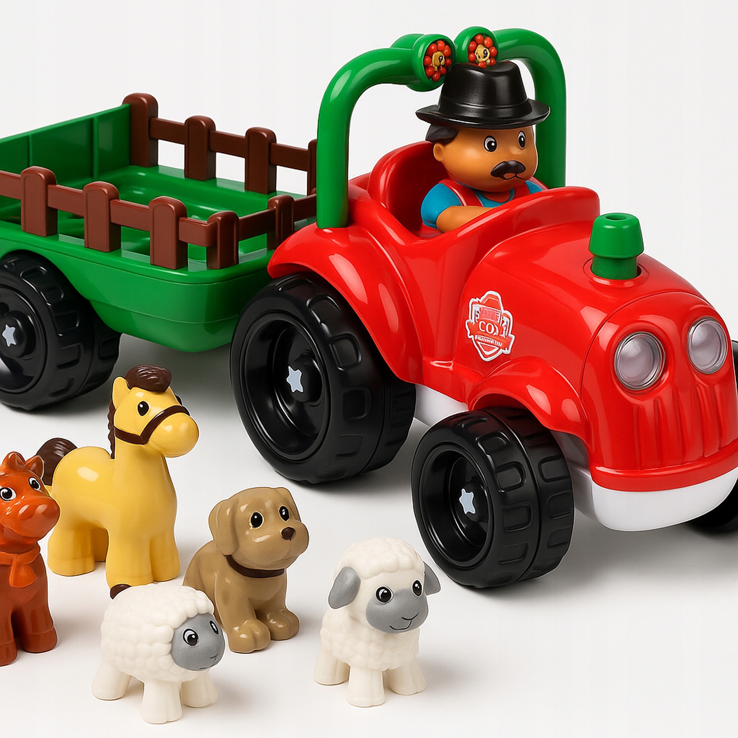 Трактор із причепом, фермером і тваринами — це унікальна іграшка, яка поєднує в собі реалістичний вигляд, інтерактивні функції та навчальні цінності. Це не тільки ігровий транспортний засіб, але й повний набір для ферми, який дозволить вашій малечі відчути себе справжнім господарем.