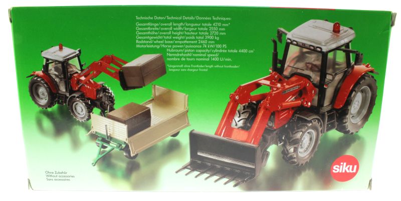 Висококласна модель трактора Massey Ferguson з пересувним фронтальним навантажувачем і знімною кабіною. Виготовлена з металевих і пластикових деталей, що зберігають деталі справжнього автомобіля, масштаб 1:32. Гумові шини дозволяють вільно пересуватися по різних поверхнях. Цікава пропозиція для шанувальників серії SIKU Farmer. Веселощі зроблять привабливішими сільськогосподарські аксесуари в масштабі 1:32.