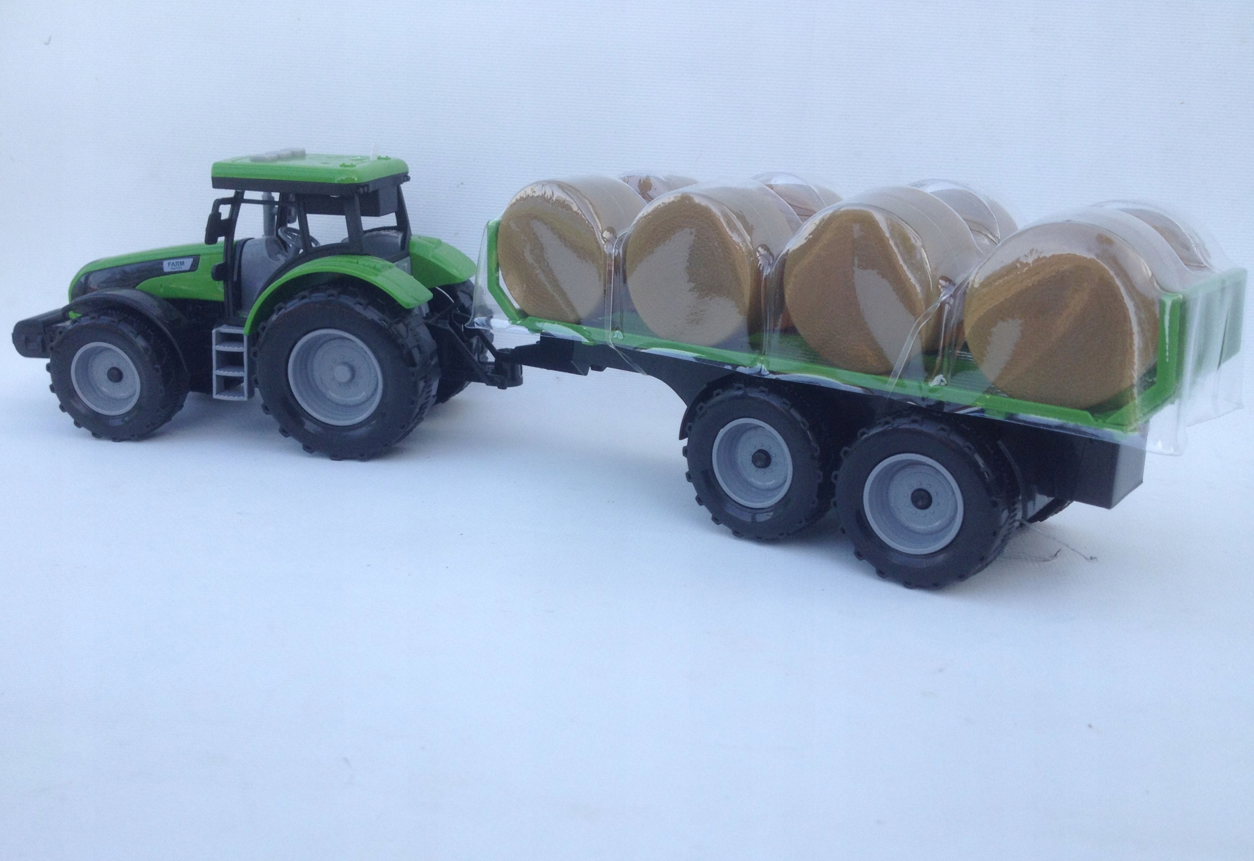 Іграшка дуже добре зроблена і не відрізняється від зовнішнього вигляду від справжнього трактора. Набір включає трейлер з сіновими кульками. Набір має 8 журналів, які можна покласти на причіп. Трейлер має підтримку складки, а трактор -це рухома гачок причепа, який дозволяє його скріплювати і розстебнути. Весело стане набагато цікавішим завдяки кнопкам, розміщеним на даху трактора. Натиснувши їх, ми почуємо звуки трактора, і вогні запалити.