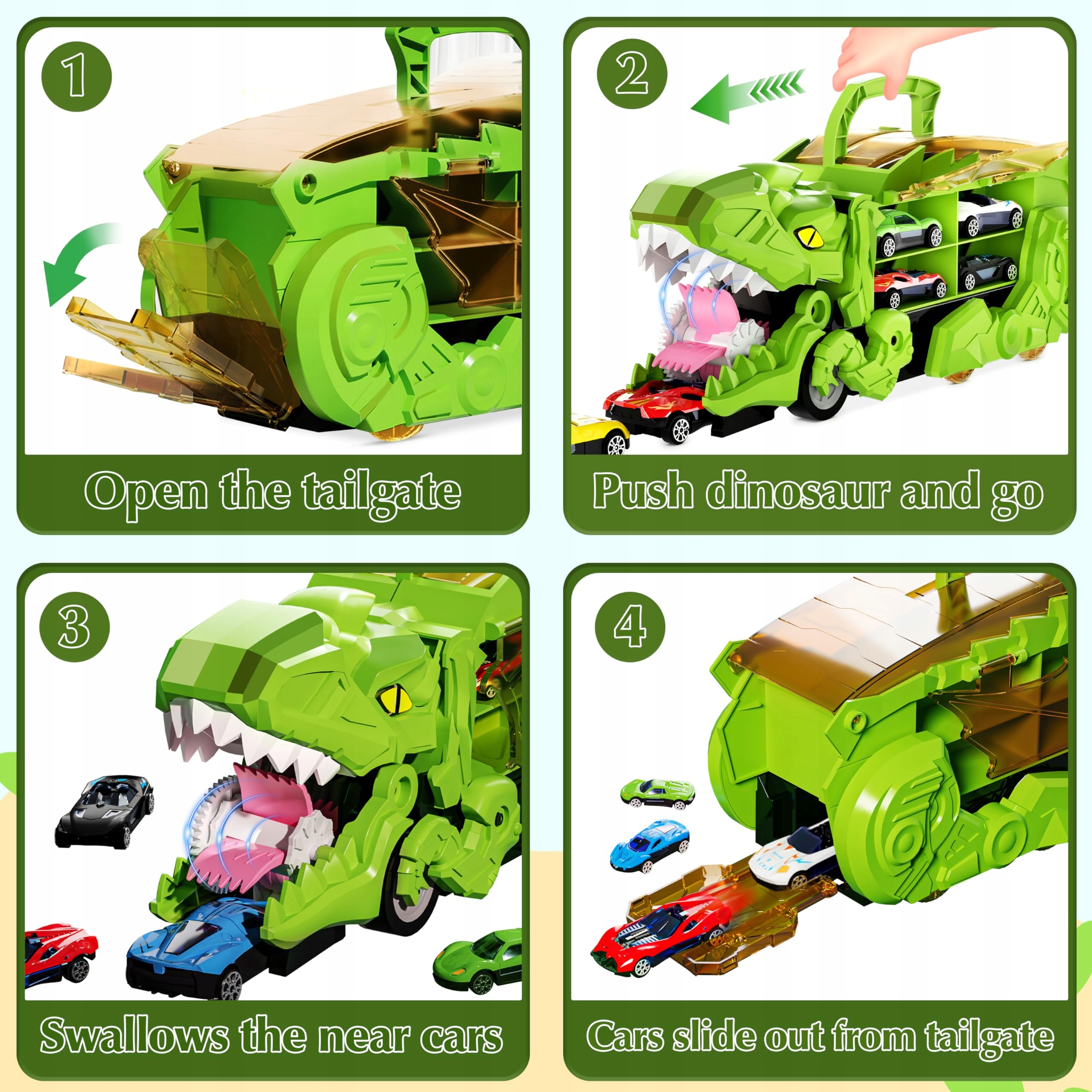 ✔ [автомобіль, що пожирає] Ця іграшкова машина для доставки була результатом із пащею монстра, штовхніть іграшку-транспортера динозавра вперед, вона «з’їсть» машину попереду, і машину, яка був «з’їдений» динозаврами, він вийде з хвоста динозаврів, імітуючи розвиток, приносячи азарт і веселощі.