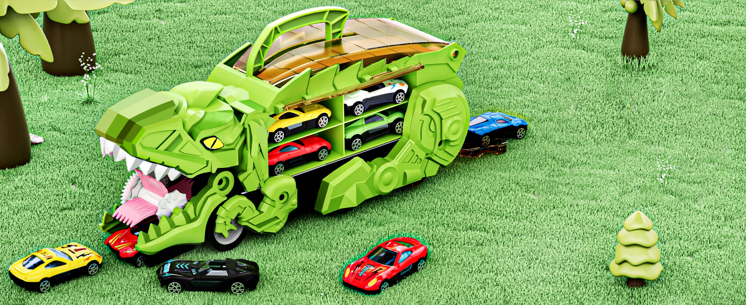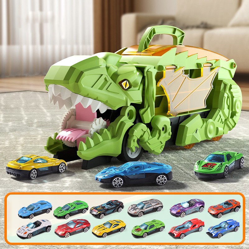 [Набір динозаврів-трансформерів] Наш набір автомобілів-динозаврів включає 1 велику транспортну машину Тиранозавра Рекса (розмір: 33 * 13 * 12 см), 12 міні-литих машин-купе (розмір: 7 * 3 * 2 см). ).
