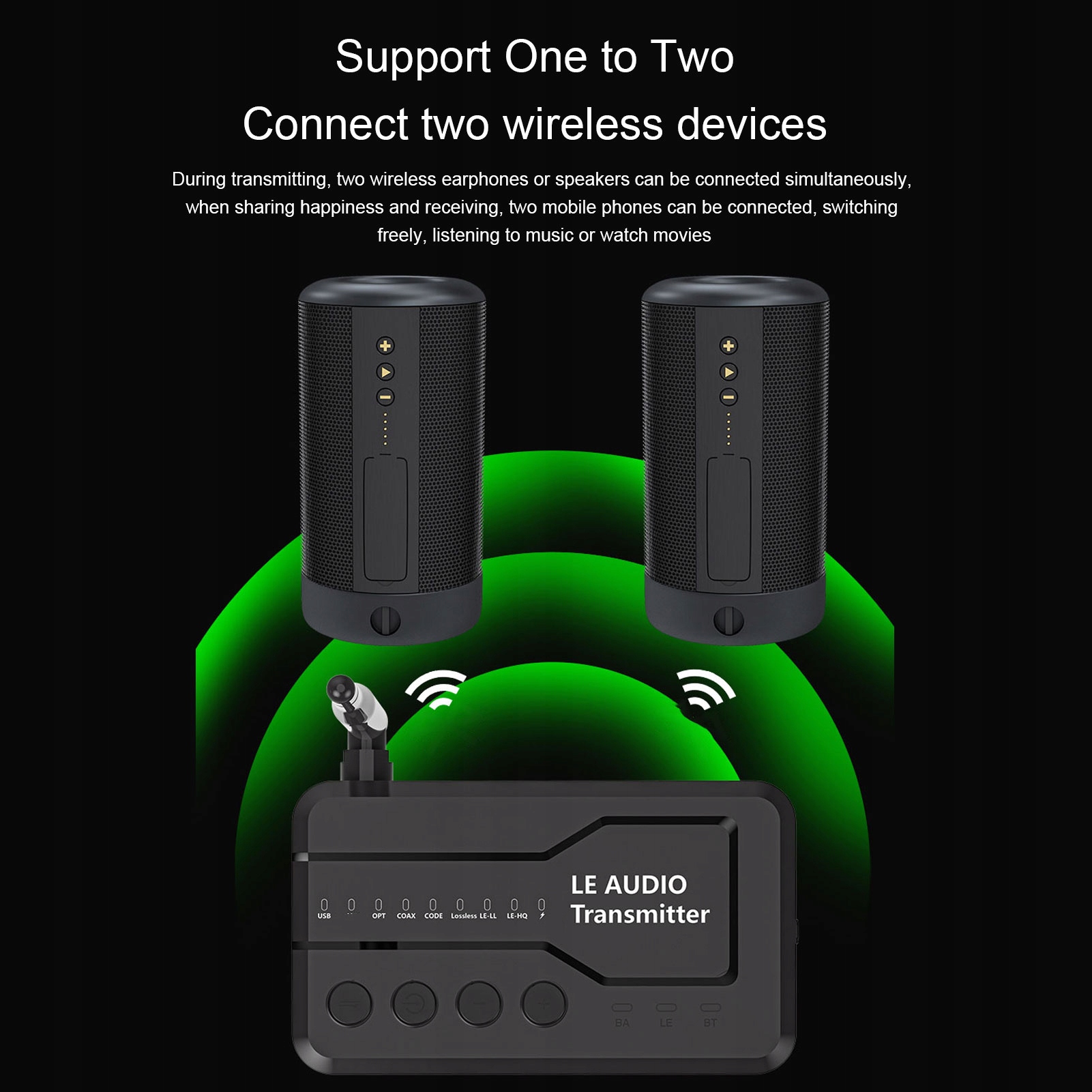 3. LE Audio Mode: Використовуйте цей передавач для передачі звуку з одного джерела на кілька приймачів. Якщо ці пристрої знаходяться в радіусі передавача Bluetooth і підтримують потокове аудіо, вони можуть отримувати аудіо, що дозволяє бездротовим способом передавати аудіо з одного пристрою на кілька динаміків або навушників Bluetooth