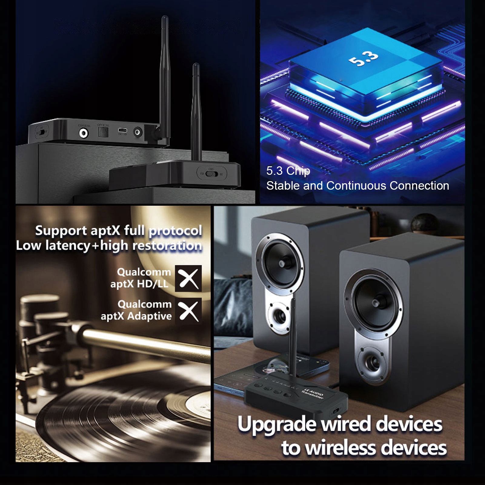 6. Гнучкий і практичний: передавач Bluetooth підтримує аудіовходи USB, AUX, OPTICAL і COAXIAL, пропонуючи гнучке підключення та сумісність із 99% телевізорів, проекторів, комп’ютерів та інших пристроїв