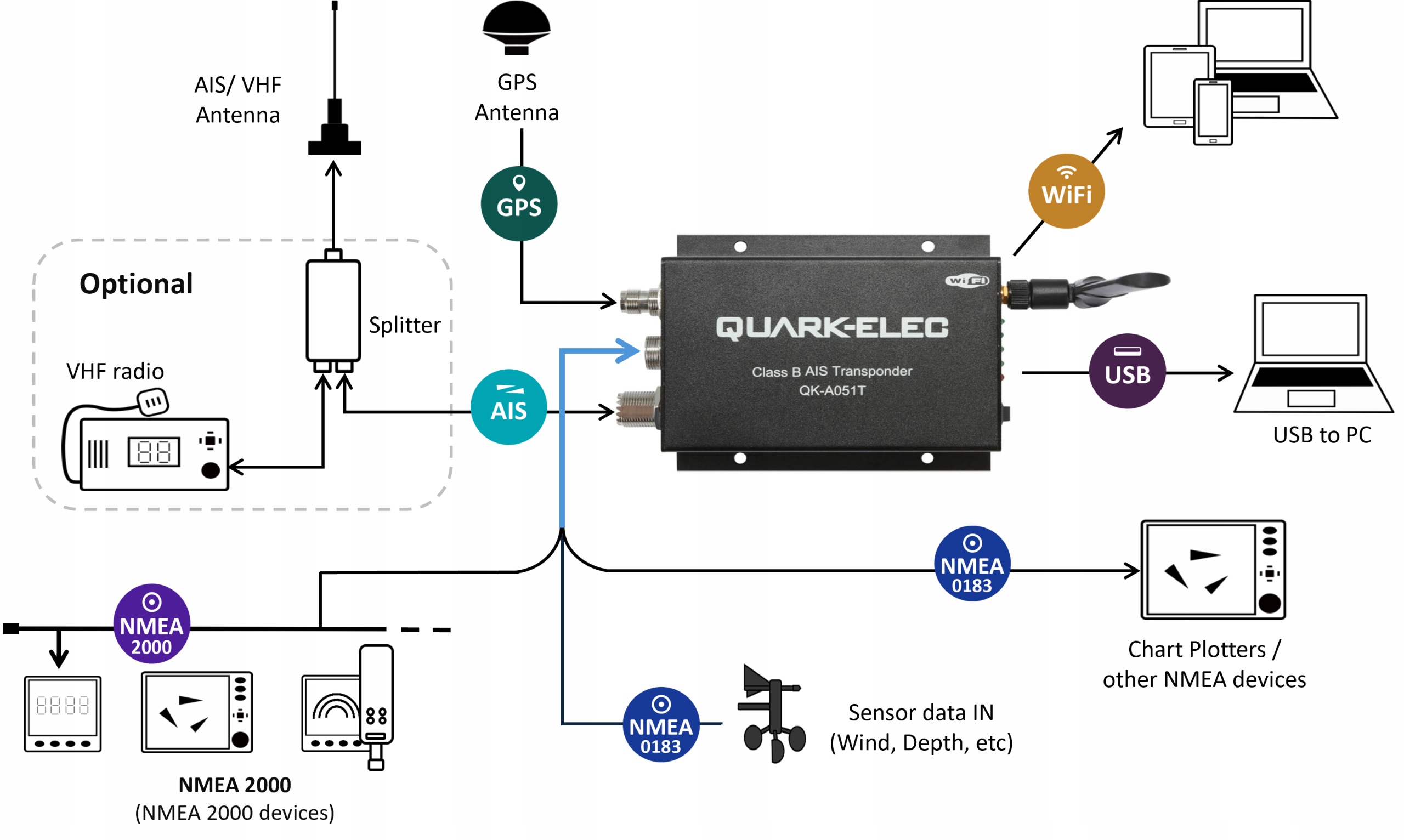 Транспондер A051T класу B WiFi & NMEA 2000 AIS без служби програмування