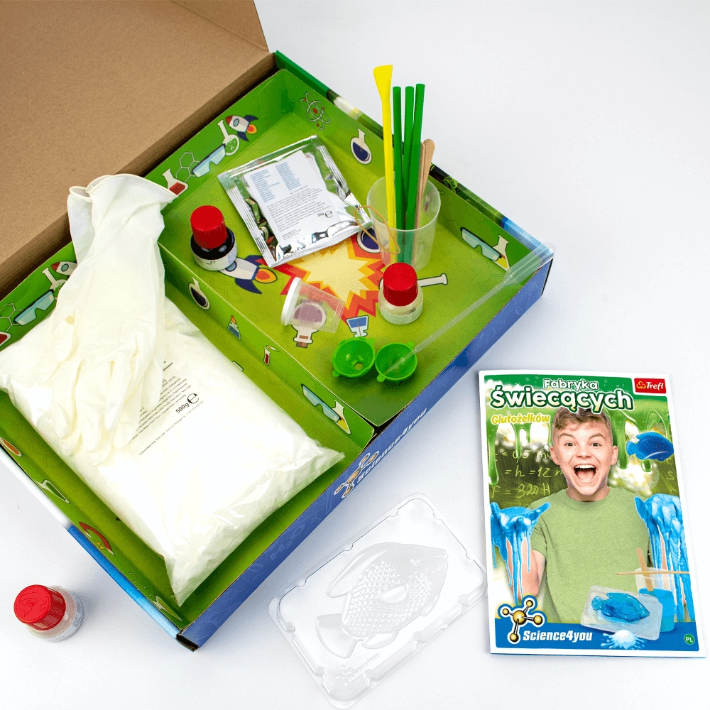 З набором Science4You Glowing Glutogels Factory ви можете робити глютенгелі, які світяться в темряві. Чому маса світиться? З’ясуйте, що таке речовина люмінофор і чим флуоресценція відрізняється від фосфоресценції. Дізнайтеся, що таке неньютонівська рідина, якими властивостями володіють полімери та познайомтеся з тими, що оточують нас щодня. Чи знаєте ви, що все, що має масу і займає простір, є матерією? Дізнайтеся про процеси, що призводять до зміни агрегатного стану.