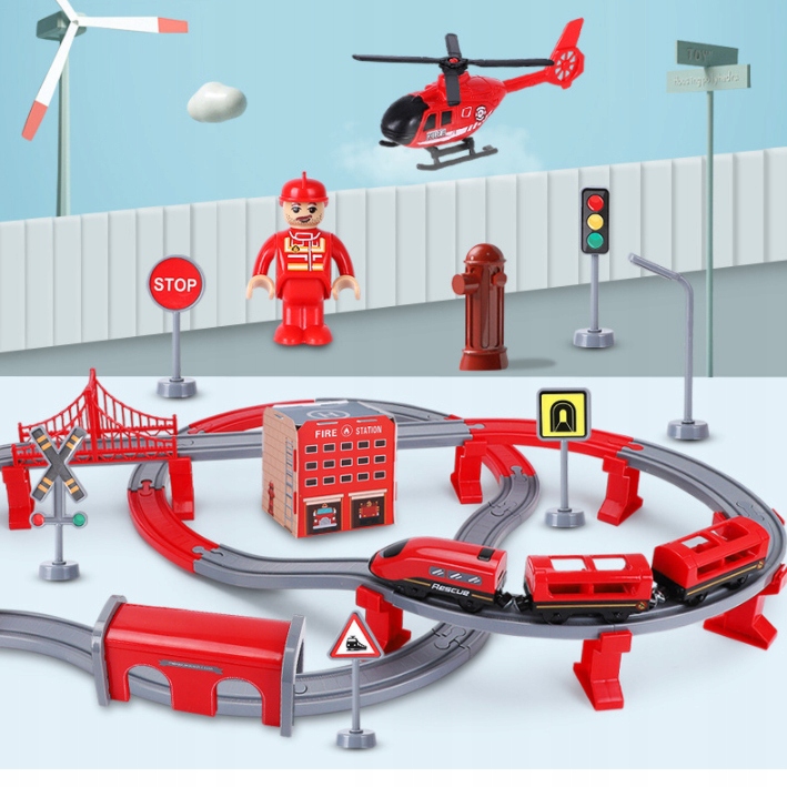 Зроблений з неймовірною турботою та увагою, поїзд із автомобілями пожежної бригади є ідеальним місцем для розваги для майбутнього машиніста чи пожежника. Набір доповнили муляж пожежної частини з вертолітним майданчиком, тунель, міст, підвісний міст і дорожні та залізничні знаки. Всі елементи виготовлені з пластику найвищої якості, що гарантує довговічність і довговічність окремих елементів набору.