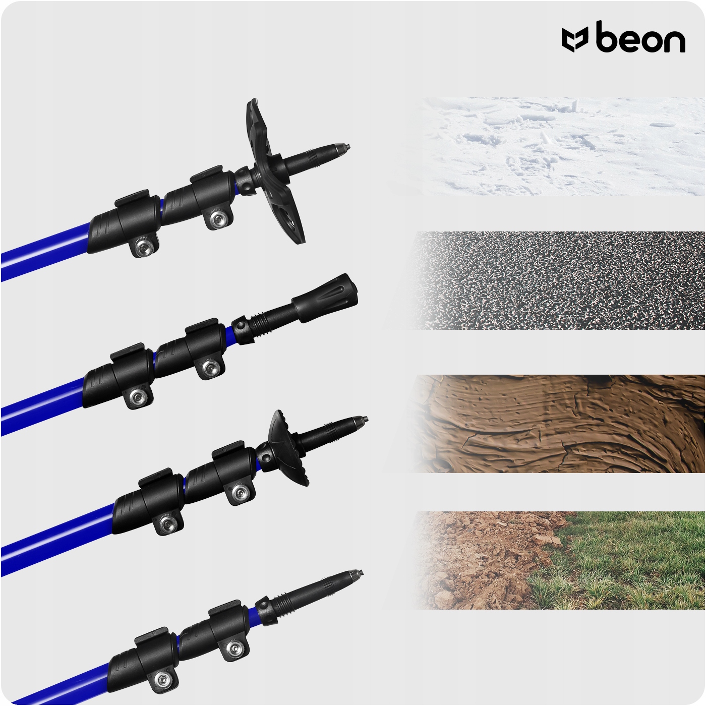 Трекінгові палиці Beon Pro оснащені набором наконечників, які працюватимуть на будь-якій поверхні. Завдяки цьому вони будуть супроводжувати вас постійно, незалежно від пори року. Ви можете використовувати їх під час ходьби по землі, снігу, грязі, гравію або асфальтованій дорозі.