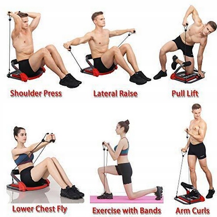 Все в одному тренажері дозволяє виконувати присідання, віджимання, їзду на велосипеді, махи ногами, розгинання трицепса, жим грудей, згинання плечей, біцепс і випади лише з одним тренажером.