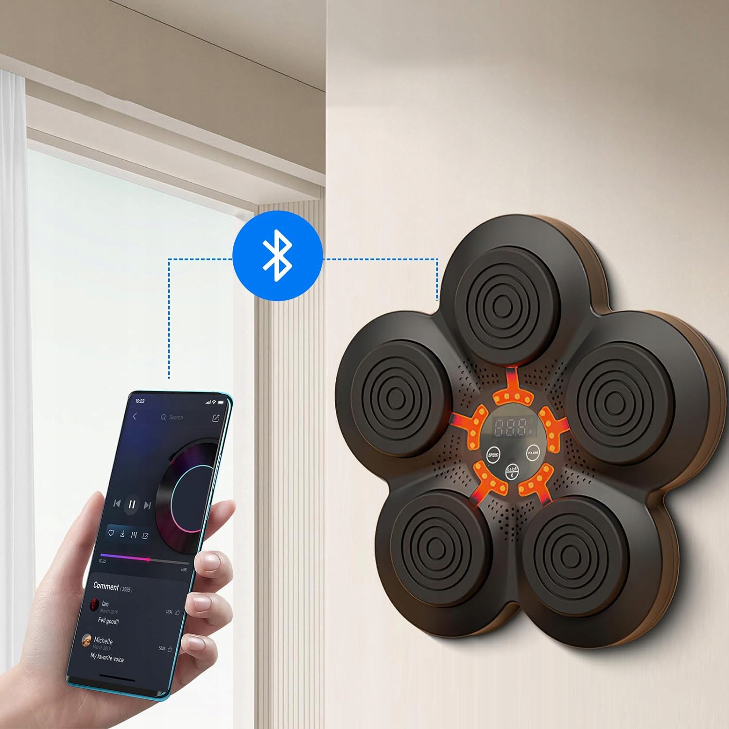 Ця музична скринька оснащена функцією Bluetooth. Просто підключіть до неї свій телефон і легко відтворюйте будь-яку пісню з телефон. Він оснащений функцією приглушення вібрації, вам не доведеться турбуватися про те, що ви заважаєте сусідам. Він має об’ємний стереозвук, тож ви можете зануритися в ритм і мелодію під час тренування.