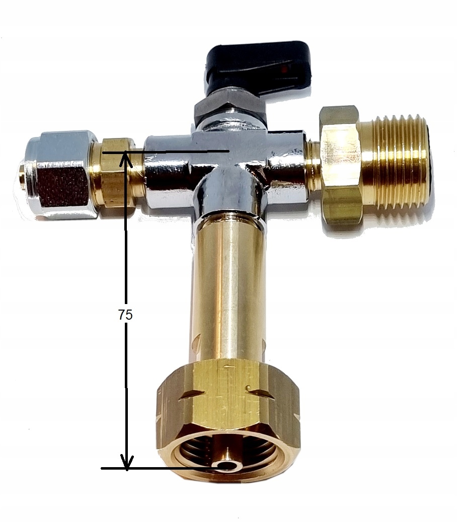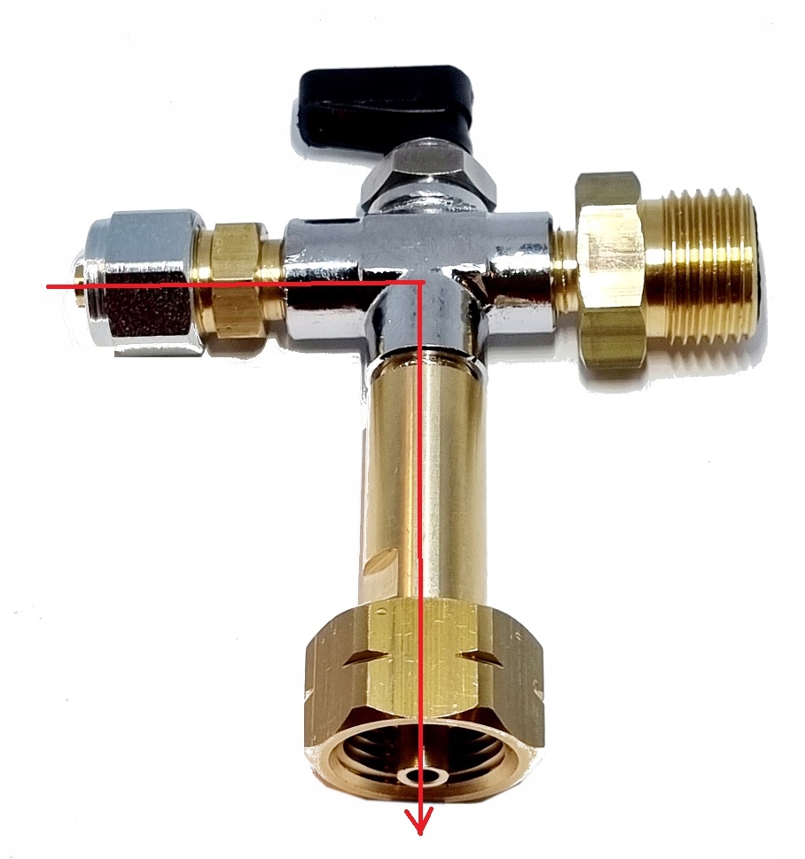 Трьохходовий кульовий кран з різьбою W21,8x1/14"L (ліва різьба - як на газовому балоні 11 кг) з одного боку та гайкою W21,8x1/14"L з одного боку інший (такий самий, що накручується на вентиль балона), третій має роз'єм для газового шланга ПВХ 8 мм