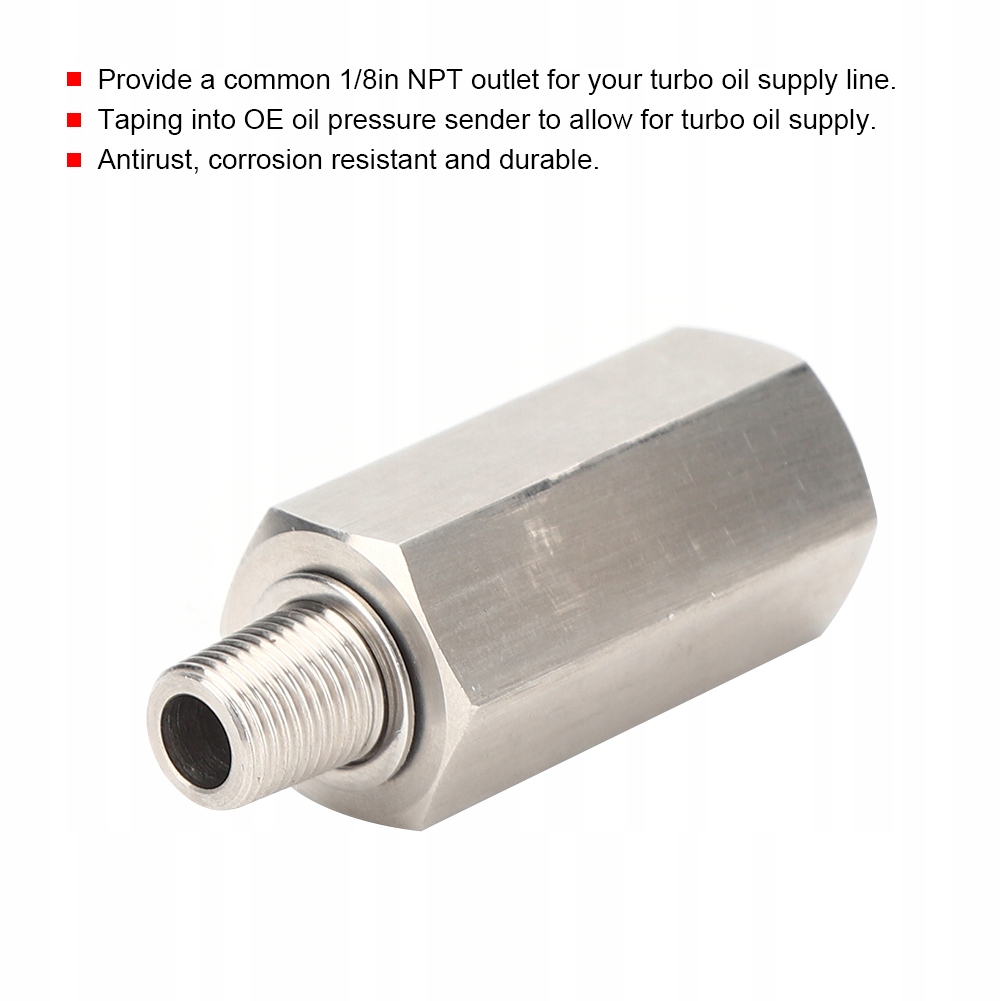 1. Універсальний 1/8-дюймовий ТРОЙНИК BSPT для кріплення до датчика тиску масла OE для забезпечення подачі масла в турбо або вторинного манометра тиску масла.