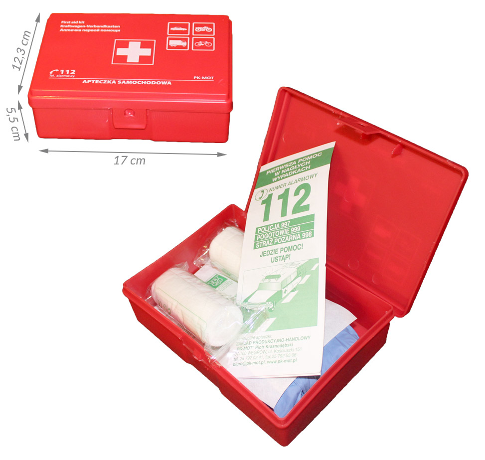 Відповідно до вимог законодавства, усі медичні пристрої, що входять до комплекту, мають маркування CE. Аптечка містить стерильні та нестерильні вироби медичного призначення. Медичні вироби одноразові. Всі товари з дійсною датою необхідно регулярно перевіряти! Увага: Зберігати в недоступному для дітей місці. Правильно укомплектовану аптечку необхідно зберігати в сухому і затіненому місці. Виробник: ZPH PK-MOT, Made in Poland, SRN no.: PL-PR-000027277