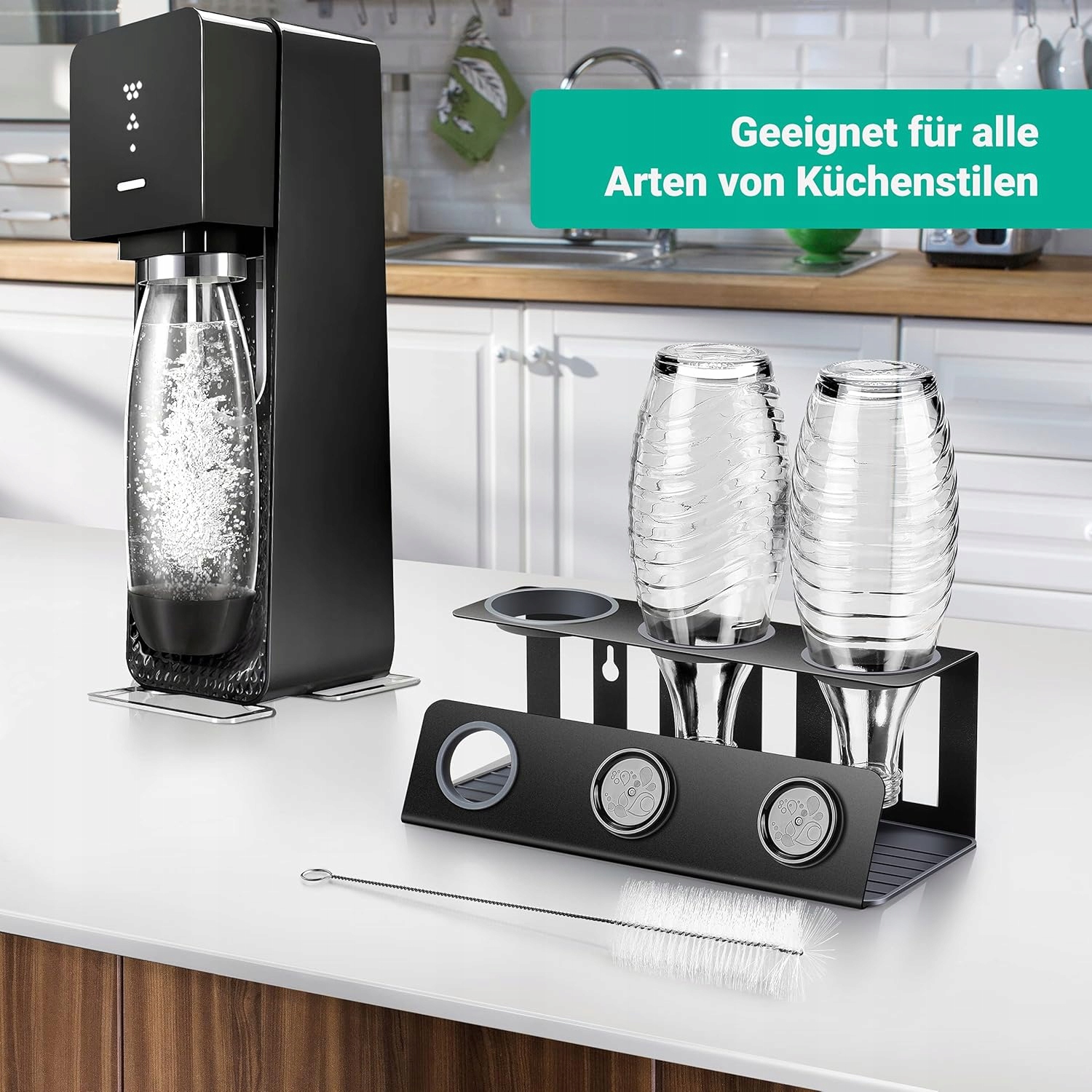 Завдяки багатофункціональній підставці для пляшок він підходить для всіх скляних/пластикових пляшок, таких як: SodaStream Crystal 2.0, Easy, Power, Penguin, Fuse - Emil Bottle - Max. Отвір пляшки: 68 мм. На додаток до тримача для пляшок із содовою, піддона для збору крапель і 3 захисних кілець для пляшок ви також отримаєте практичну щітку для пляшок для легкого чищення пляшок і кришок. Ваші безтурботні покупки - наша найвища мета.