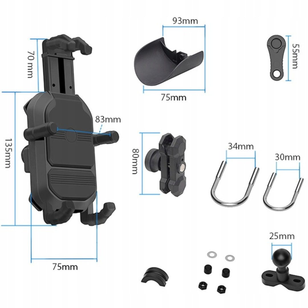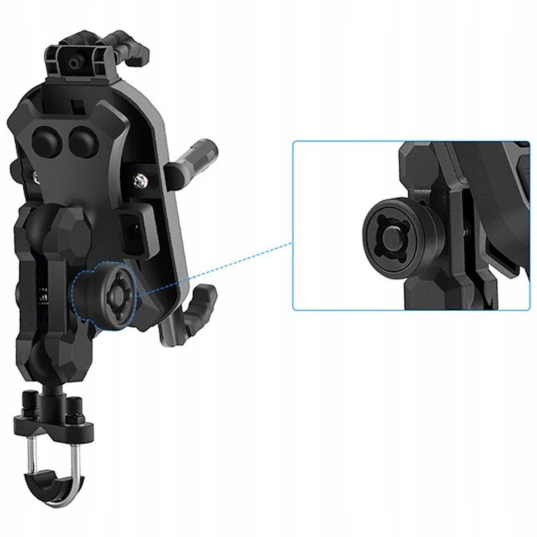 Надзвичайно міцний мотоциклетний тримач телефону, який є ідеальним рішенням для кожного мотоцикліста, який шукає надійний спосіб кріплення свого пристрою. Кожен елемент конструкції цього тримача виконаний з металу, а корпус з міцного алюмінію. Основними перевагами є антивібраційна система, протиугінна система, дощозахисна система