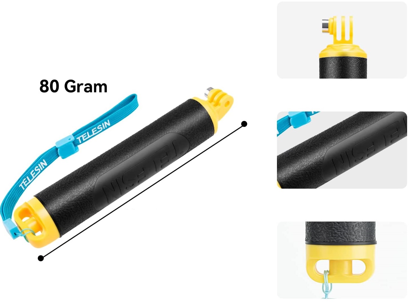 Ручка Telesin добре працюватиме як як стійка рукоятка для утримання в руці, так і як надійна ручка плавучості під час занять водними видами спорту чи гри в басейні.