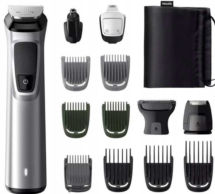 - насадки в комплекті: металевий тример, тример для укладання, точна бритва, тример для волосся в носі та вухах, бритва для тіла, регульований гребінець для бороди (3–7 мм), 2 гребінці для бороди, 3 насадки для волосся, 2 насадки на корпус, захисний ковпачок