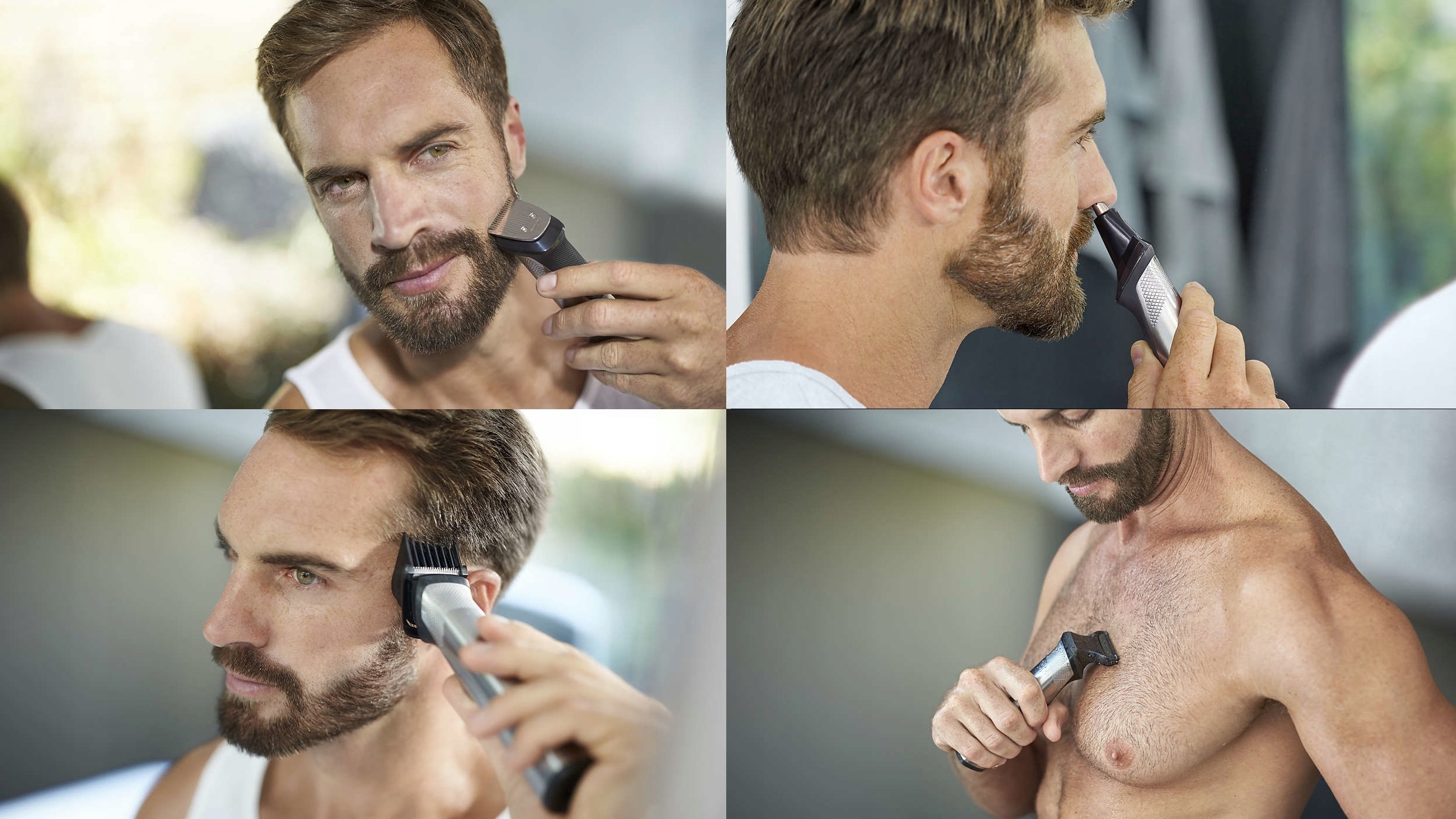 - насадки в комплекті: металевий тример, тример для укладки, точна бритва, тример для волосся в носі та вухах, бритва для тіла, регульований гребінець для бороди (3–7 мм), 2 гребінці для бороди, 3 насадки для волосся, 2 насадки для тіла, захисний ковпачок