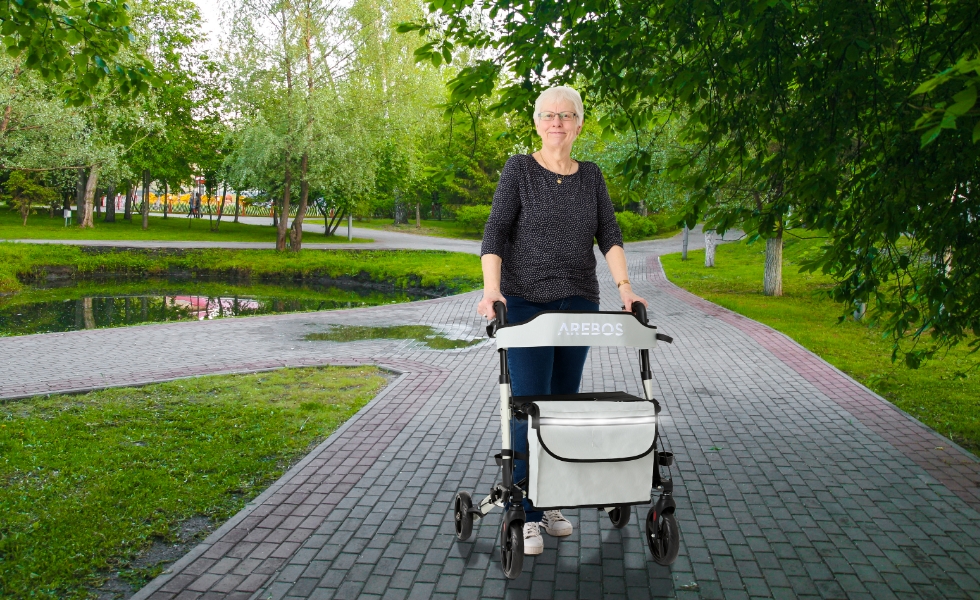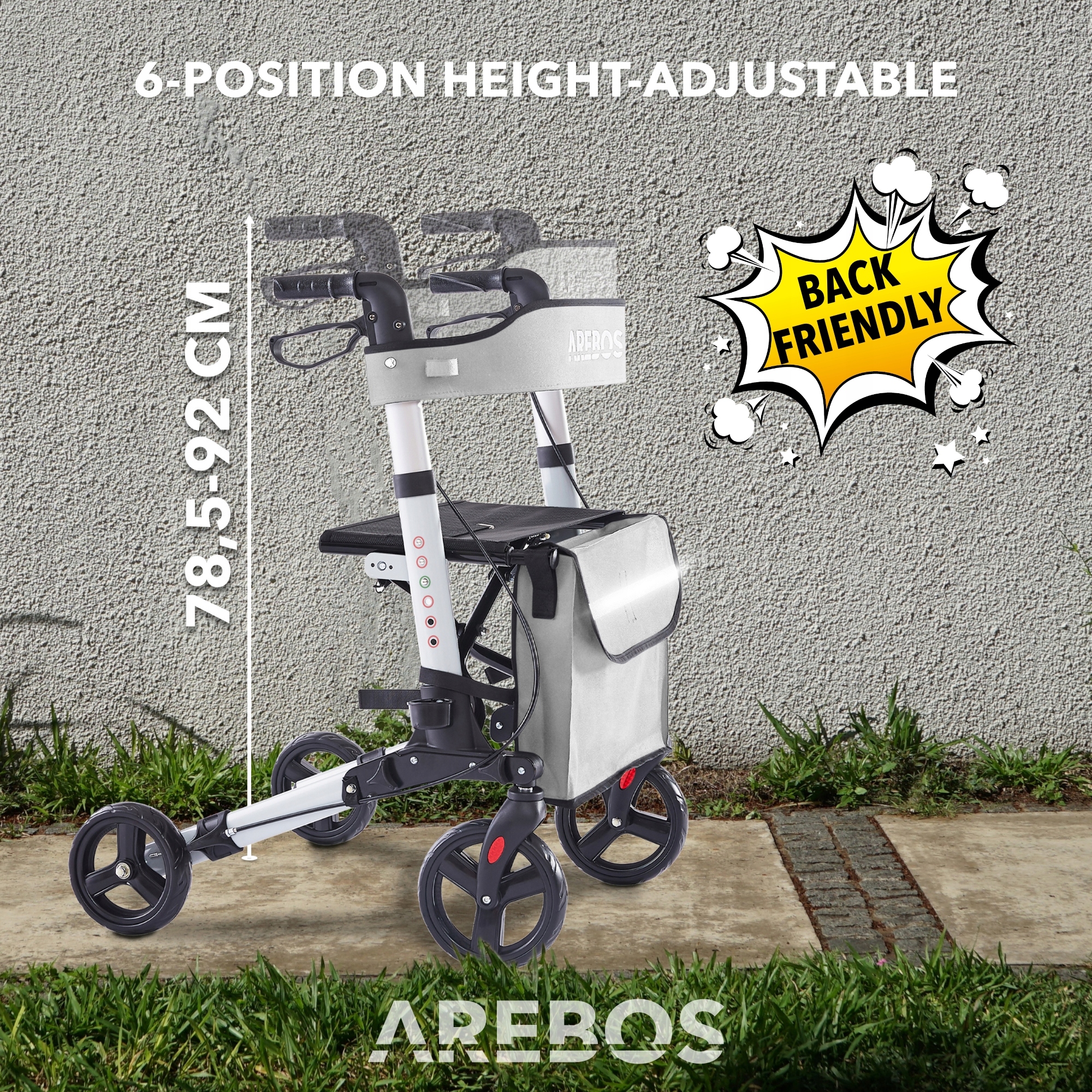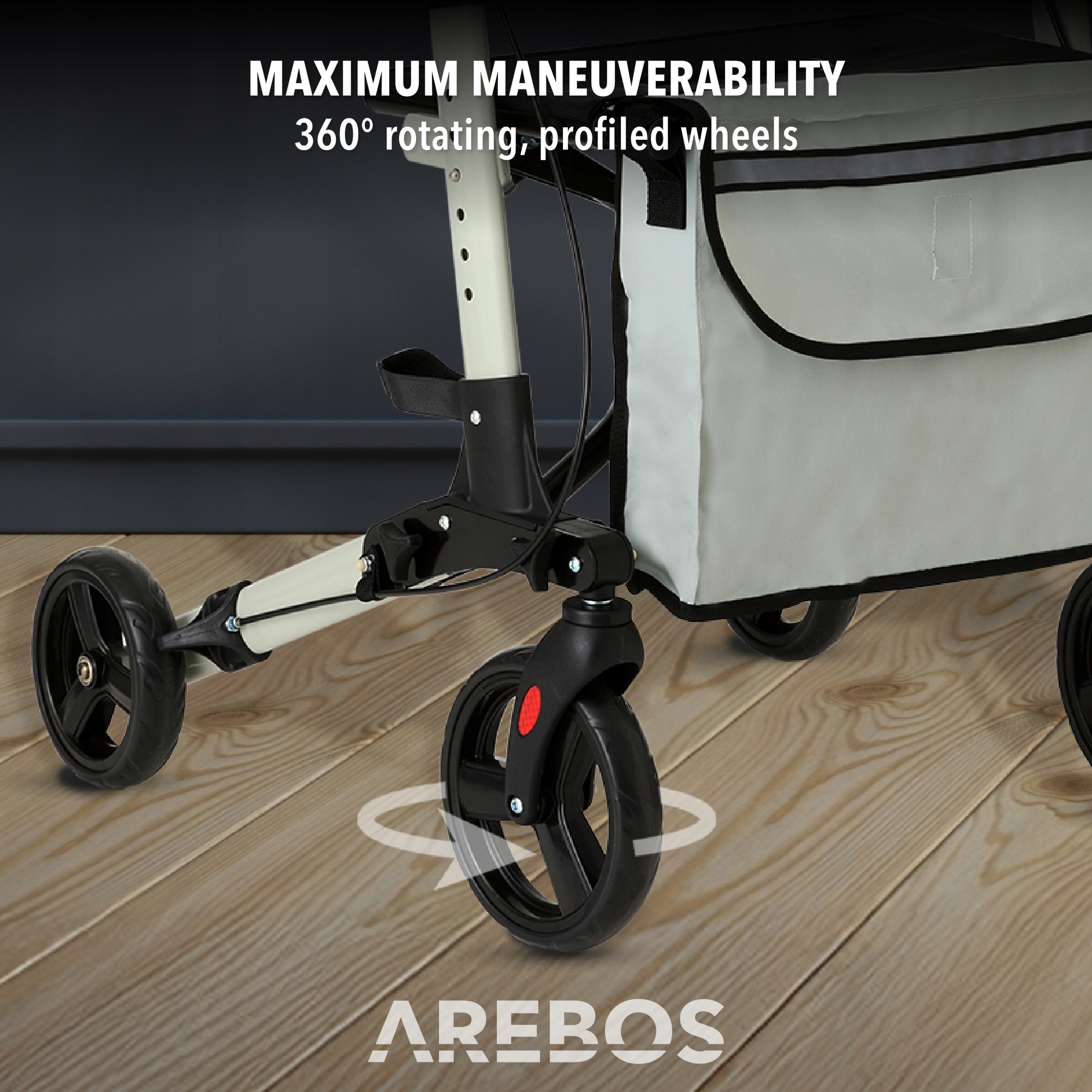 [Всі найважливіші особливості] Складання, з регулюванням висоти в 6 положеннях, 360 ° обертовими колесами, знімним мішечком, тримачем палички, ергономічними ручками з гальмом 2 в 1, допомога з альпінізмом та відбивачами - Rollar Arebos поєднує в собі комфорт, безпеку та функціональність. 4
