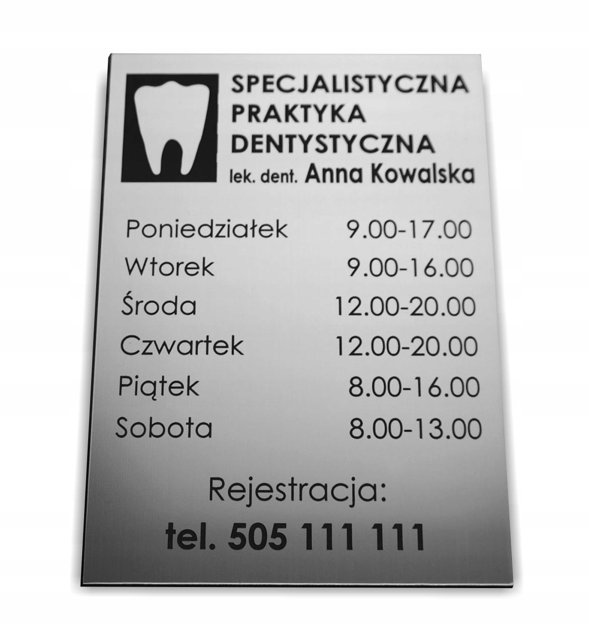 Застосування: як табличка поза будівлею та до інтер’єру, до офісу, офісу, кімнати, прийому, офісу секретаря, школи, дитячого садка, готелю, вітальні тощо. Гравірального ламінату, дуже міцного матеріалу з УФ -фільтром, стійким до погодних умов, може використовуватися зовні.