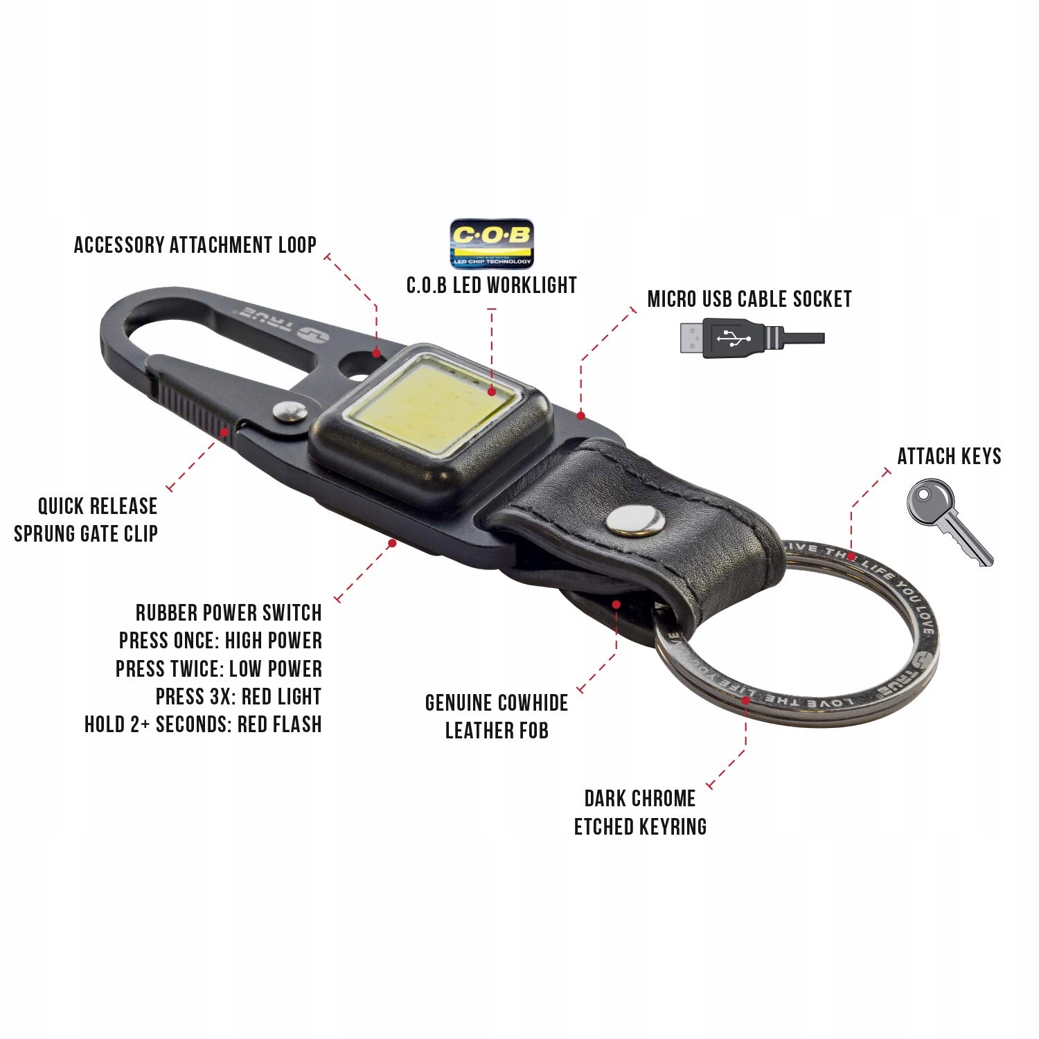 - назва товару: True Utility TU918 Cliplite, перезаряджуваний ліхтарик із затискачем для ключів, чотири режими освітлення, волова шкіра, нержавіюча сталь з титановим покриттям, один розмір, чорний, 11 см