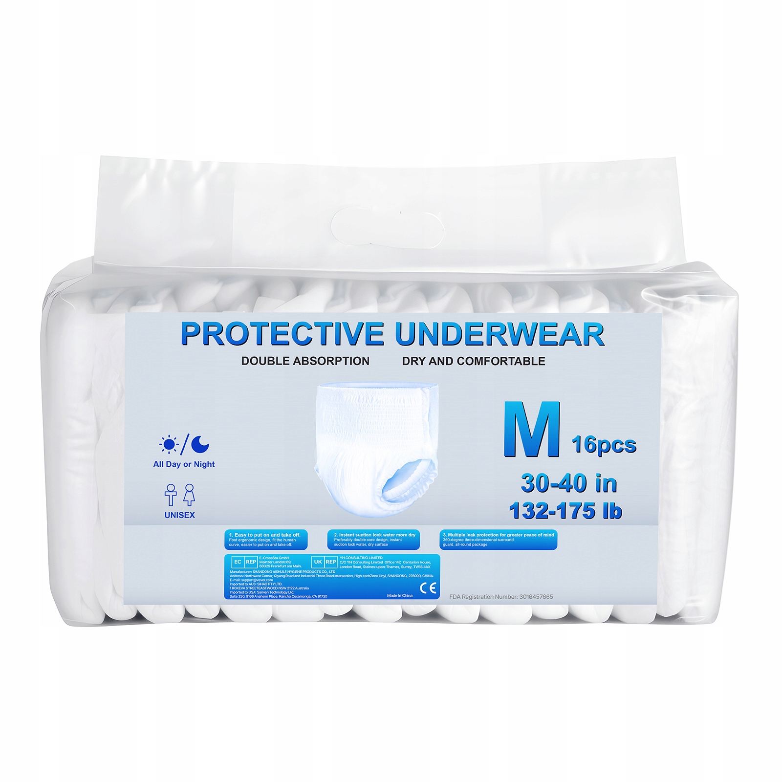Ця захисна білизна забезпечує високий рівень поглинання та може вбирати до 900 мл рідини. Забезпечує багаторазовий захист від протікання завдяки щільно прилягаючому еластичному поясу, тривимірному повному захисту та синьому поглинаючому шару для надійного захисту вдень і вночі.